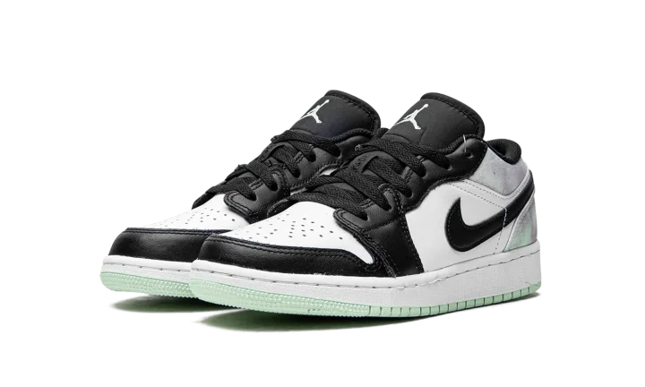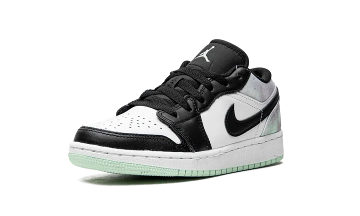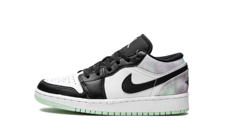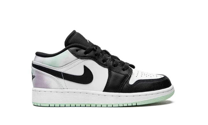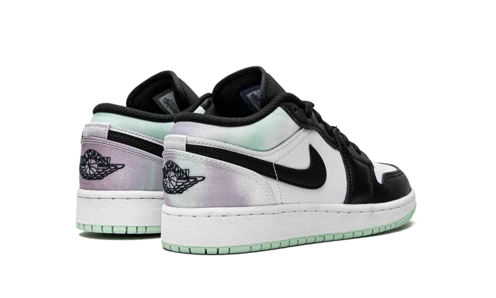 The Air Jordan 1 Low GS "Pastel Tie-Dye" is the youth sizing of the classic lifestyle sneaker in a colorway that incorporates tie-dye patterning into its look. The "Pastel Tie-Dye" is a wearable and creative colorway for the Jordan 1 Low that features a white leather base with black leather overlays on the toe, forefoot, and eyelets. Jordan Brand embroiders a black "Wings" logo on the pastel tie-dye heel overlay. A white Jumpman is found on the black nylon tongue. Finishing touches include black laces, a white midsole, and mint green rubber outsole.