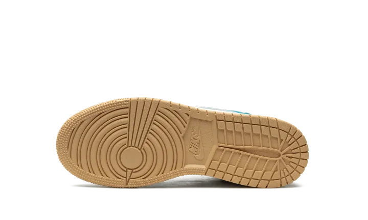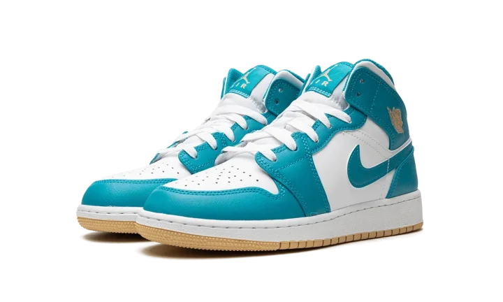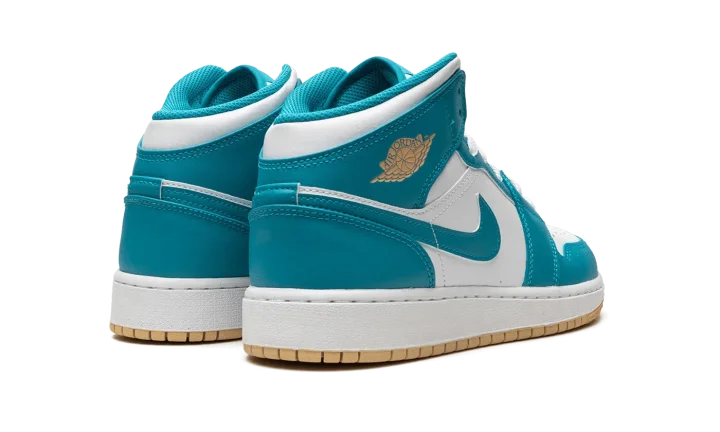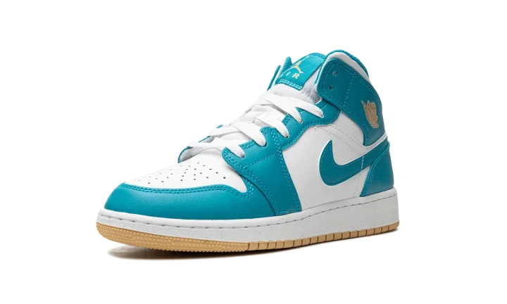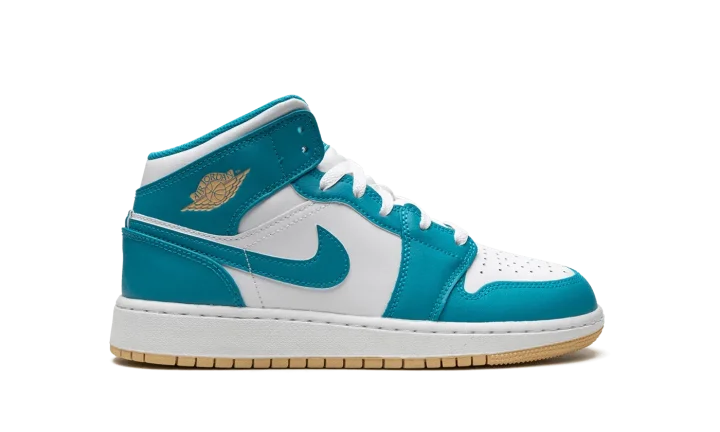 The Air Jordan 1 Mid GS "Aquatone" is the youth sizing of the colorway of the lifestyle shoe with a can't-miss design. A release from Jordan Brand's Spring 2023 collection, the "Aquatone" Jordan 1 Mid has a white leather base with Aquatone leather overlays and leather Swoosh branding. A gold "Wings" logo appears on the collar, and a gold Jumpman can be found on the aqua-colored tongue tag. The shoe is mounted on a white rubber midsole and gum outsole. Release date: April 11, 2023