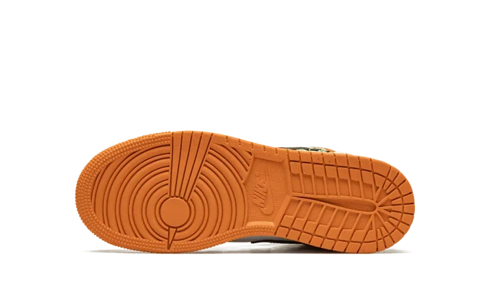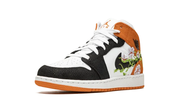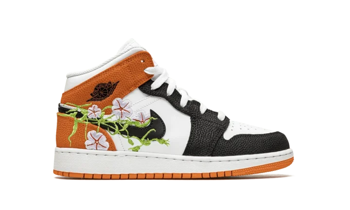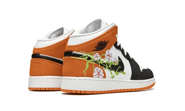 The Air Jordan 1 Mid GS "Basketball Blossom" is a youth edition of the lifestyle sneaker in a colorway with floral embroidery. A creative look for the Jordan 1 Mid for kids from Jordan Brand's Summer 2022 footwear collection, the "Basketball Blossom" features blossoming flowers in a vine-like design on the shoe's black leather Swoosh. Both the black overlays on the toe cap, forefoot, and eyelets, and the Starfish-colored overlays on the collar and heel feature a basketball-textured leather finish. A classic black "Wings" logo appears on the collar. An orange Jumpman and Swoosh are found on the tongue.
