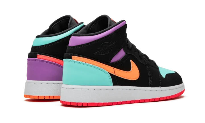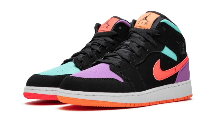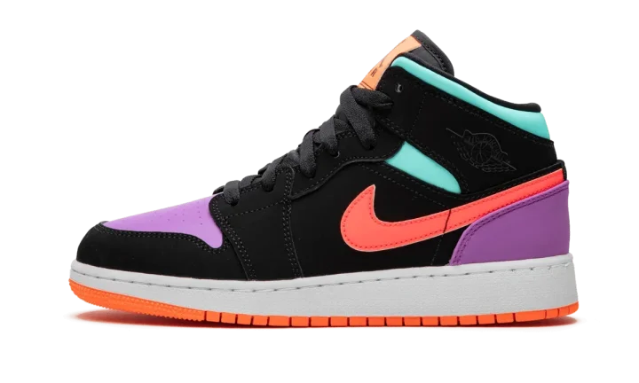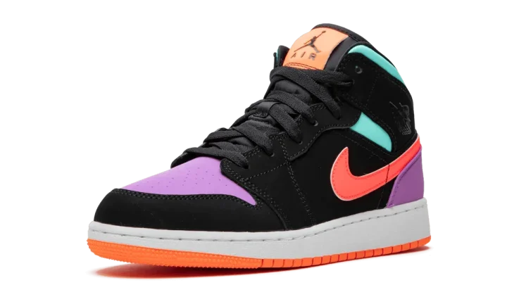 The Air Jordan 1 Mid GS "Black/Orange/Purple" in youth sizing is a colorful take on the mid-top Air Jordan 1. Even in grade school sizing, the Air Jordan 1 Mid shares many of the same elements of the classic high-top as it features a black nubuck base that covers the mid-panel, collar, and toe cap. Lively color contrasting appears on the Swoosh-branded mid-panel, with a perforated purple nubuck toe on the left shoe and a perforated turquoise nubuck covering the right shoe. Purple accenting appears on the ankle collar beneath the black overlays on the right shoe with turquoise peeking beneath the same overlay on the left shoe. Further mismatching can be found on the tongue tags with an orange base composing the left shoe and a vibrant pink base covering the right shoe. Lastly, a white rubber sole with mismatched outsoles puts the finishing touches on the playful Air Jordan 1 Mid in youth sizing.