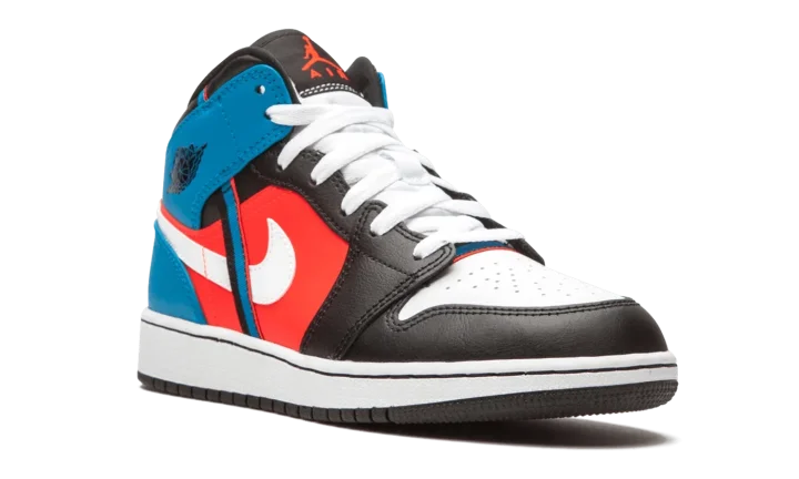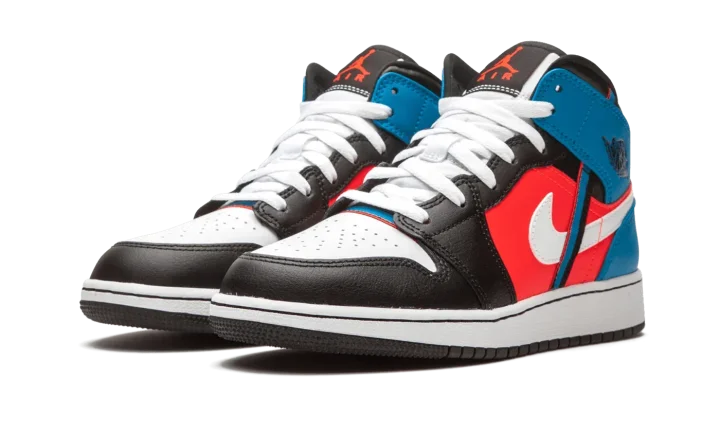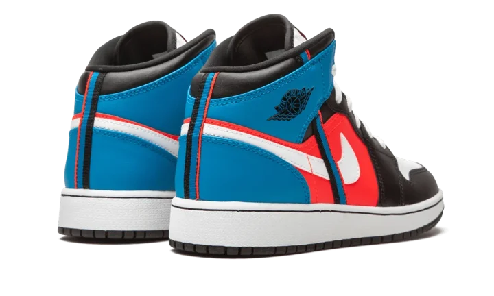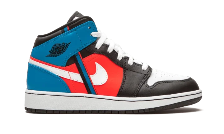 The Air Jordan 1 Mid GS "Game Time" is a new multicolor makeup of Michael Jordan's first signature shoe in youth sizing. This Jordan 1 Mid features an intriguing mixture of colors that appeals to children. The upper features white perforated leather on the toe and smooth white leather on the Swoosh that dots either side of the shoe. Contrasting black leather overlays on the forefoot, eyelets, and collar breakup the appearance. Bold pink leather can be found on the mid-panel. A vertical two-tone blue and black nylon stripe spans from the blue leather collar overlay to the midsole for a unique detail. Black "Wings" detailing appears on the collar.