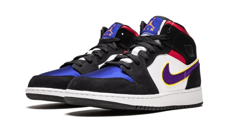 The Air Jordan 1 Mid GS "Lakers Top 3" is a youth edition of the mid-top Jordan 1 that combines the "Top 3" concept with Los Angeles Lakers team colors for the Swooshes. This Jordan 1 Mid is built in leather and synthetic nubuck with satin panels for the toe and ankle. The red, white, black, and blue color scheme is reminiscent of the popular "Top 3" colorway of the Jordan 1 High that combines the iconic "Bred," Chicago," and ''Royal" Jordan 1s. Meanwhile, the double Swooshes feature a yellow base and purple satin top layer that call to mind the Lakers. The Air Jordan 1 Mid GS "Lakers Top 3" for kids released in 2019.