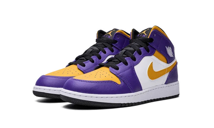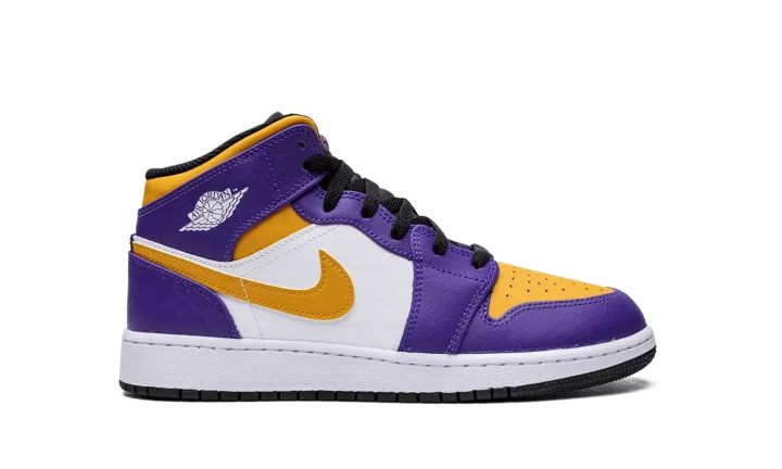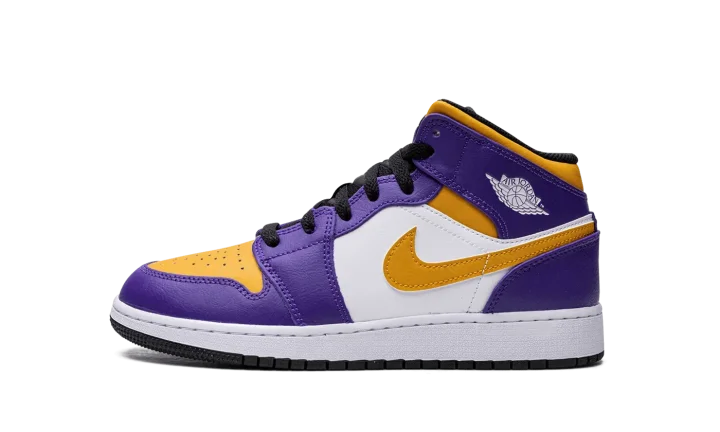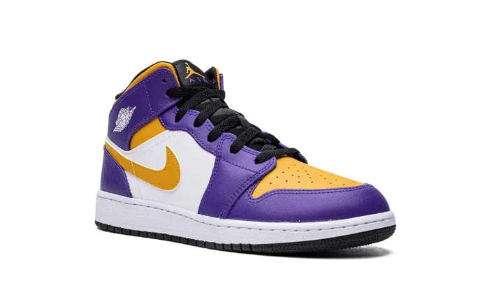 The Air Jordan 1 Mid GS "Lakers" is the youth sizing of the colorway that features the Los Angeles Lakers team uniform colors on its design. In spite of its nickname, the Jordan 1 Mid is not affiliated with the Lakers in any way, although it does draw favorably from the basketball team's uniform colors. Yellow leather appears on the perforated toe and collar while contrasting purple leather is found on the overlays. A yellow leather Swoosh appears on either side of the shoe and a white "Wings" logo can be found on the collar. Yellow Jumpman branding is paired with purple "Air" detailing on the tongue tag of the black nylon tongue. A white midsole and black rubber outsole complete the look. Release date: September 17, 2022