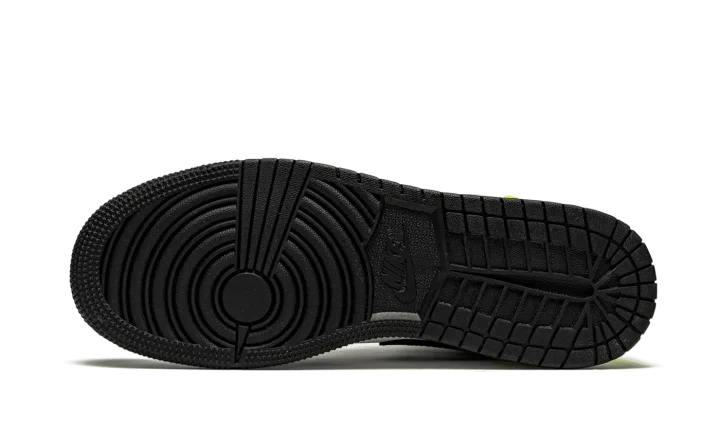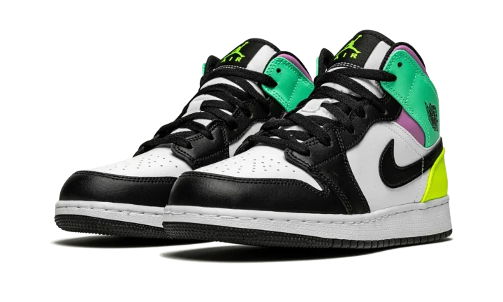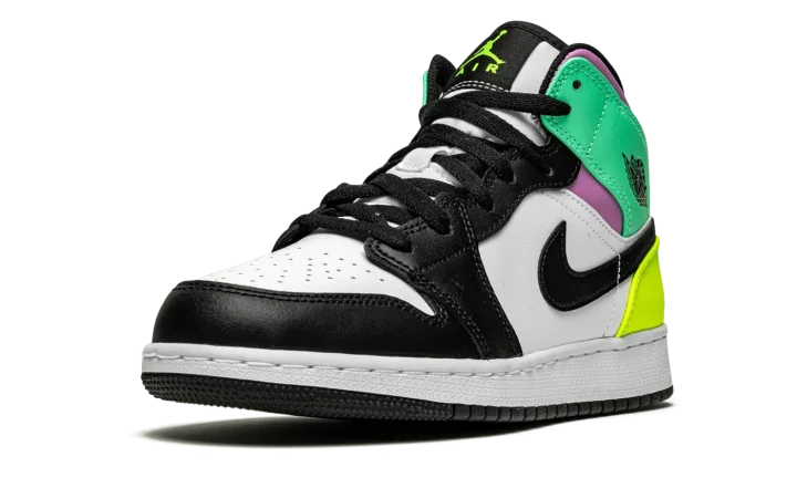 The Air Jordan 1 Mid GS "Pastel" is a vibrant, kids' exclusive colorway of Michael Jordan's first signature shoe in the popular mid-top silhouette. A combination of head-turning neon and pastel colors on the leather panels attracts attention on the "Pastel" Jordan 1 Mid. The forefoot, eyelets, and Swoosh feature a black leather construction. Both the perforated toe and the mid-panel are designed in white leather. A black "Wings" logo appears on the Green Glow leather panel layered above the purple leather collar. A contrasting Volt leather panel can be found on the heel. Additional Volt accenting appears on the Jumpman and "Air" branding on the black nylon tongue tag. Black laces, a white nylon tongue, and a white midsole and black outsole complete the look.