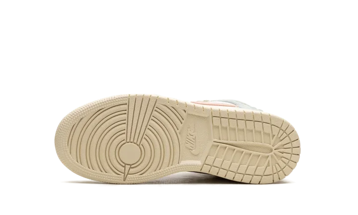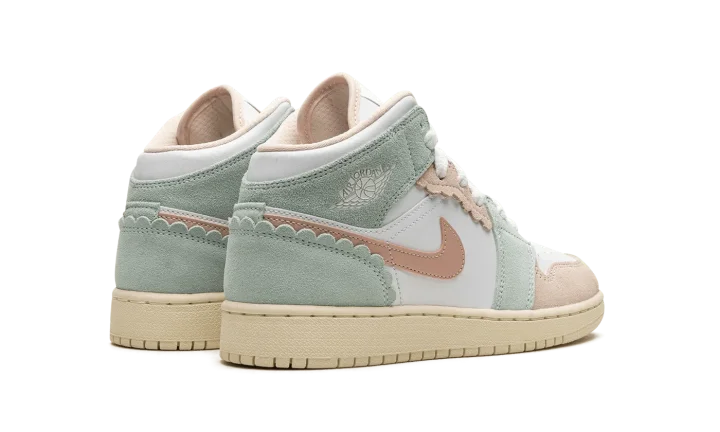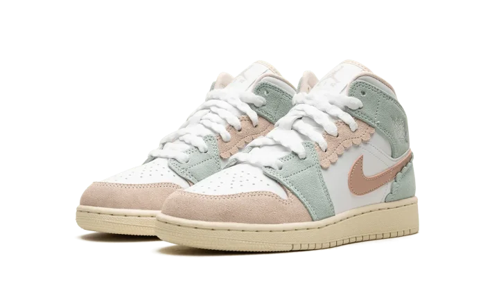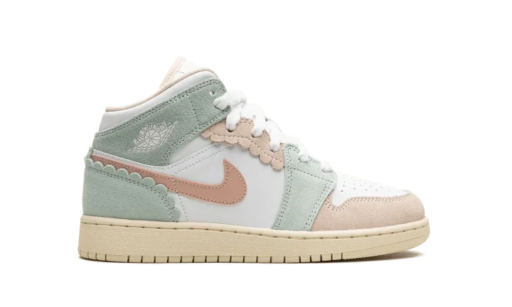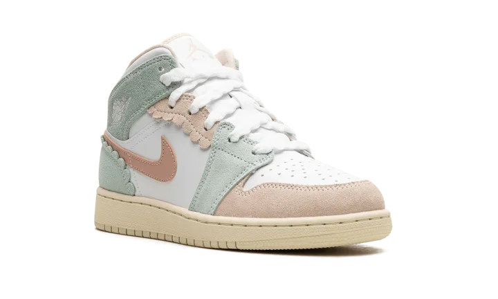 The Air Jordan 1 Mid GS "Pink Oxford" is the youth sizing of the lifestyle shoe with raised overlays. The "Pink Oxford" gives the Jordan 1 Mid a unique appearance with suede pastel-colored overlays with scalloped-style edges. The upper's base is constructed in white leather while the Swoosh is designed in Pink Oxford-colored leather. A classic "Wings" logo appears on the collar overlay while a Jumpman is found on the tongue. Underfoot, the Coconut Milk-colored rubber sole completes the look. Release date: July 20, 2023