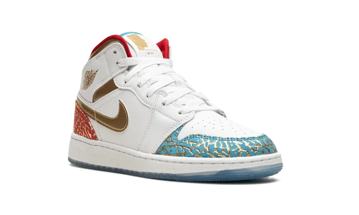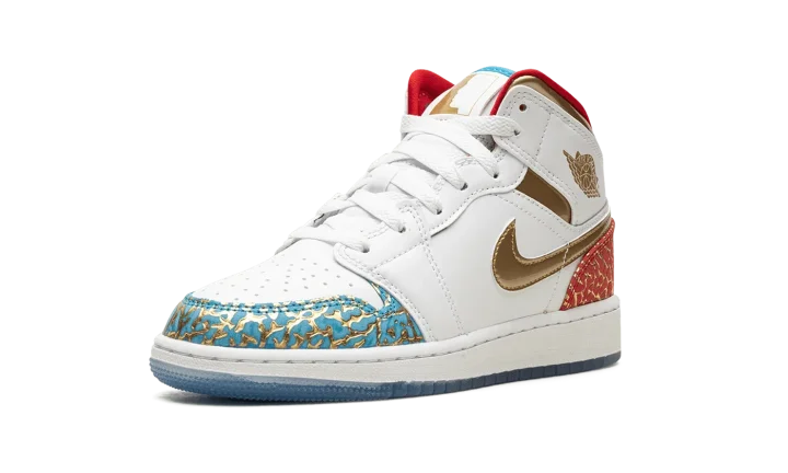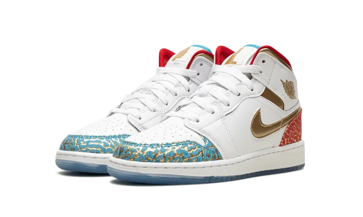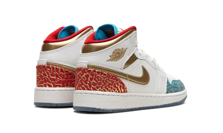 The Air Jordan 1 Mid GS "UNC to CHI" is the youth sizing of the colorway that shows love to Michael Jordan's college and professional basketball careers. The "UNC to CHI" theme debuted on the Air Jordan 1 High OG before it appeared on other Air Jordan models, including this Jordan 1 Mid. For this interpretation of the "UNC to Chicago" theme, Jordan Brand gives the colorway elephant print overlays inspired by the patterning seen on the Air Jordan 3. Blue Lightning-colored elephant print inspired by the North Carolina Tar Heels, Jordan's alma mater, appears on the toe while University Red elephant print inspired by the Chicago Bulls, Jordan's NBA team, is seen on the heel. White leather is found on the base. A Metallic Gold leather Swoosh and "Wings" logo give the shoe a championship-inspired look. Release date: June 24, 2023