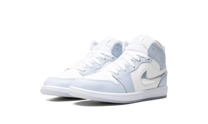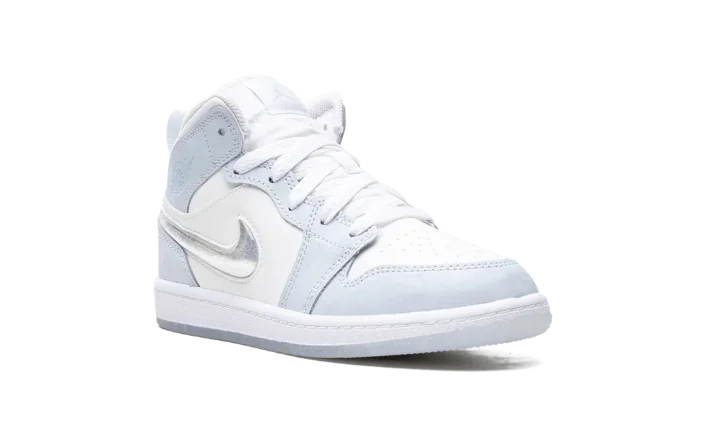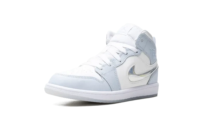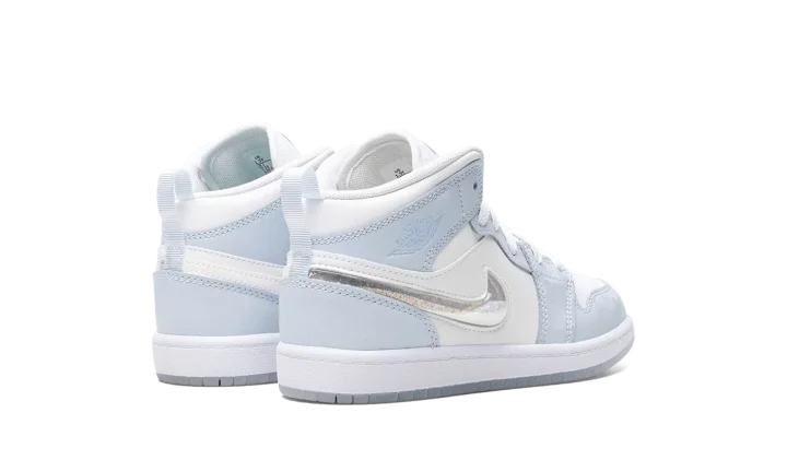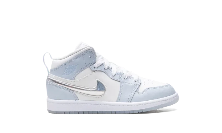 The Air Jordan 1 Mid PS "Glitter Swoosh" is the preschool sizing of the shoe with a winter-inspired design. The upper is complete with a Summit White leather construction with Blue Tint leather overlays. The Swoosh on the lateral side is constructed in clear plastic with glitter that can move around inside it for a unique and fun look inspired by snow globes. A light blue "Wings" logo can be found on the collar, while a Jumpman appears on the tongue tag. Underfoot, a white midsole and icy blue translucent outsole complete the winter theme. Release date: November 27, 2023