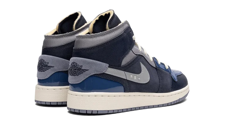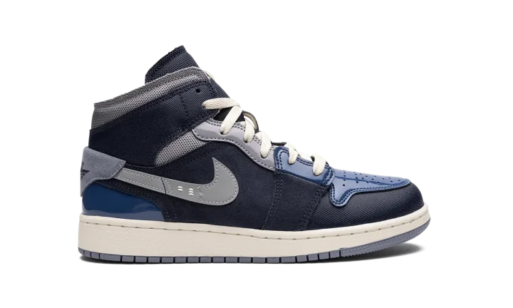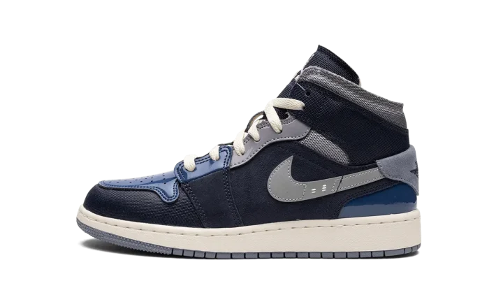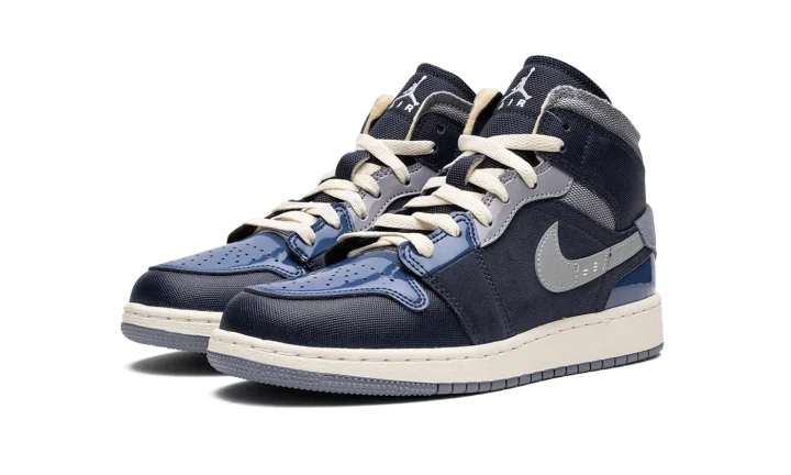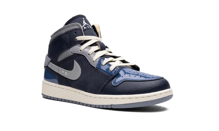 The Air Jordan 1 Mid Craft GS "Obsidian" is the youth sizing of the popular sneaker with a contemporary look. The Jordan 1 Mid Craft is an alternate version of the lifestyle shoe that modifies its design with a "do-it-yourself" inspired spin. The "Obsidian" gives the Jordan 1 Mid Craft an inside-out look with mismatched panels in various textiles. Blue-colored patent leather can be found on the perforated toe and lower eyelet while Obsidian suede appears on forefoot and mid-panel. The blue hue also graces the toe cap and heel. A grey Swoosh is found on the sides. An overlay panel with "Wings" branding is located on the back of the shoe, moved from its placement on the collar on the Air Jordan 1 Mid's original design.