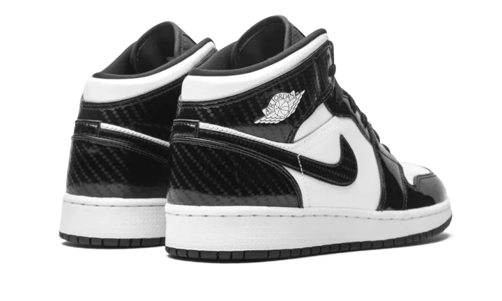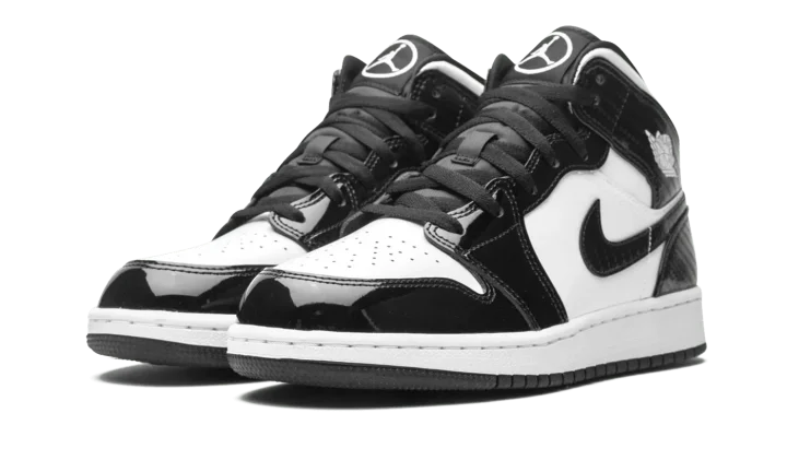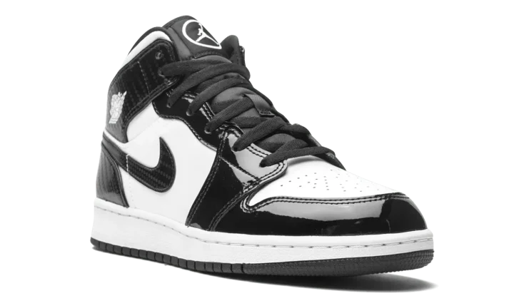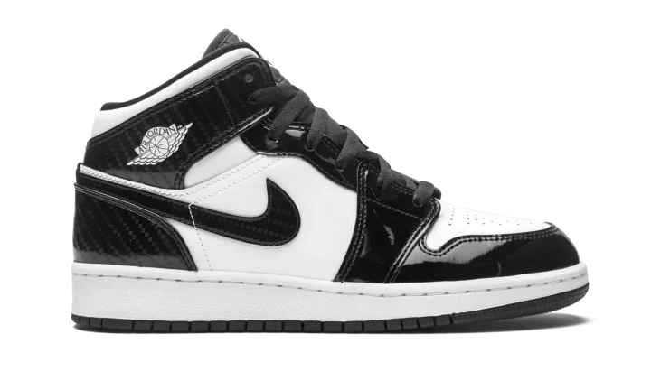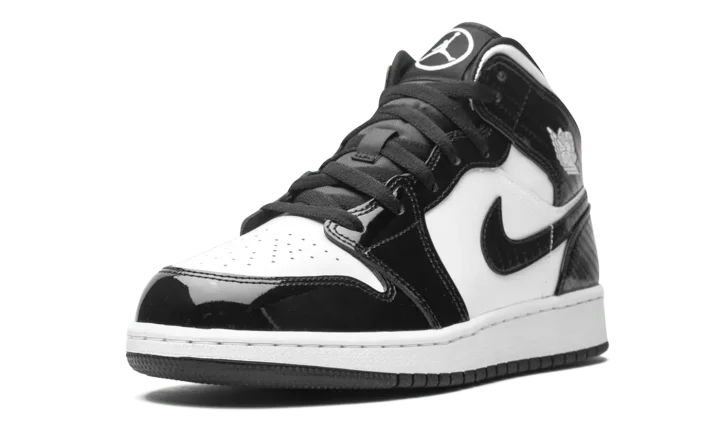 The Air Jordan 1 Mid SE GS "All-Star Weekend 2021" is the youth sizing of Michael Jordan's first signature shoe that salutes the NBA's annual All-Star Weekend festivities. Dressed in what could be best described as a very Air Jordan 11 "Concord" like black and white color scheme, the Jordan 1 Mid "All-Star Weekend 2021" is a classic design for kids. Overtures to the previously mentioned "Concord" makeup include the black patent leather overlays on the forefoot, toe cap, eyelets, collar, and heel. The perforated toe, mid-panel, and collar display a smooth white leather construction that contrasts with the aforementioned glossy black overlays. The black Swooshes as well as the heel and collar panels are given a carbon-fiber-like texture, which seems to be a further nod to the Jordan 11. A circular Jumpman emblem is printed on the black nylon tongue tag to denote the special All-Star Weekend theme. Release date: February 2021.