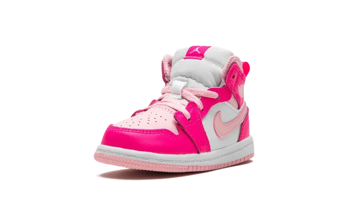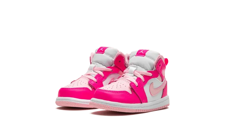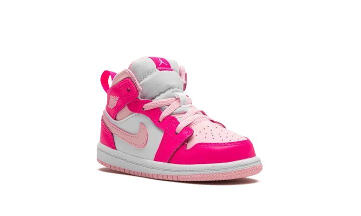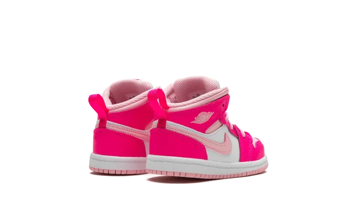 The Air Jordan 1 Mid "Fierce Pink" is a colorway of lifestyle shoe for toddlers with a hard-to-miss appearance. The vibrant look features a Medium Soft Pink leather toe with Fierce Pink-colored leather overlays. Medium Soft Pink accenting is also seen on the leather Swoosh on the sides and on the collar. A classic "Wings" logo appears on the overlay on the collar and a Jumpman is found on the tongue. Underfoot, the white rubber midsole and pink rubber outsole put the finishing touches on the baby-sized Jordan 1 Mid's design. Release date: July 24, 2023