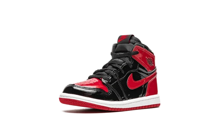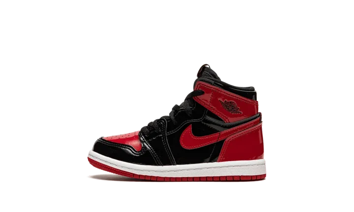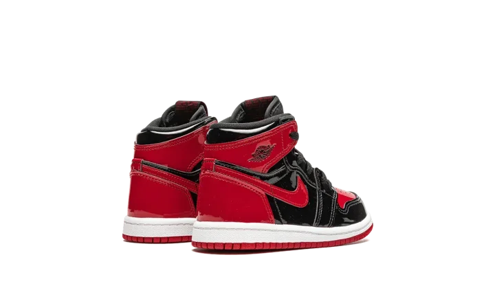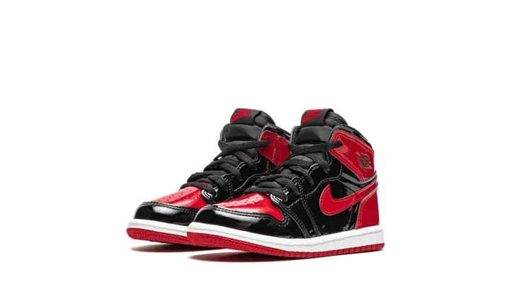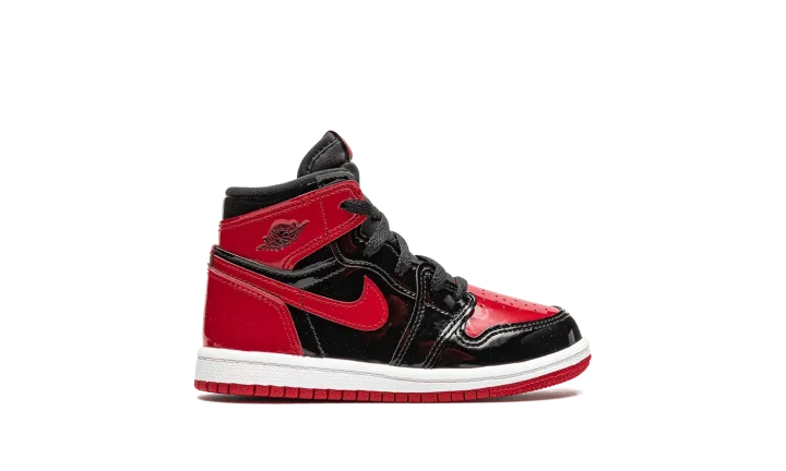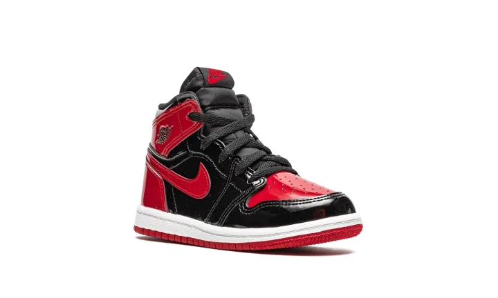 The Jordan 1 High TD "Bred Patent Leather" is the toddler sizing of Michael Jordan's first signature shoe in a modified version of the original "Bred" colorway. The "Bred Patent Leather" is an alternate version of the black-and-red shoe that features glossy patent leather panels in place of standard leather. Varsity Red patent leather is found on the perforated toe, collar, heel, and Swoosh. Contrasting black patent leather appears on the overlays. A black "Wings" logo is located on the collar and red "Nike" and Swoosh branding is printed on the black nylon tongue tag. Release date: December 30, 2021