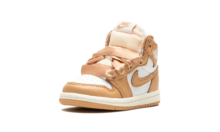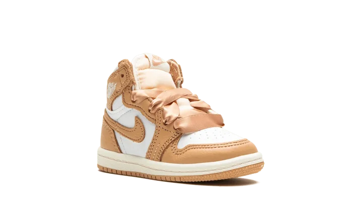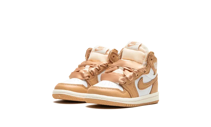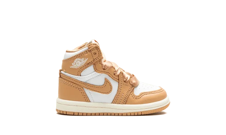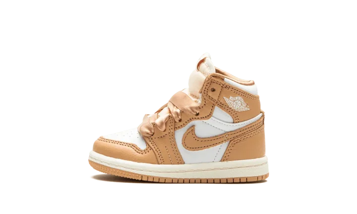 The Air Jordan 1 High OG TD "Praline" is the toddler sizing of Michael Jordan's first signature sneaker with a lifestyle-focused design. Released in women's sizing for adults, the "Praline" Jordan 1 High OG was also produced in children's sizes. The shoe's design features a white leather upper contrasted with Praline, or tan, leather overlays and a Praline leather Swoosh. Satin ribbon-style laces replace the Jordan 1's original laces for an opulent look. Other details include a white "Wings" logo on the collar and a Praline-colored Nike logo on the tongue tag. Underfoot, a cream rubber midsole and tan rubber outsole complete the look. Release date: September 13, 2023