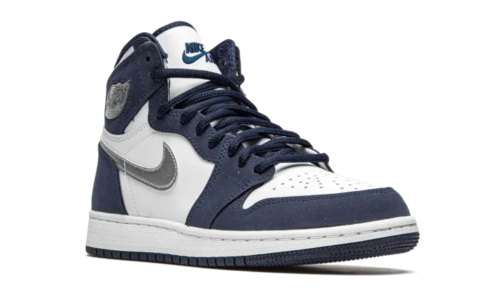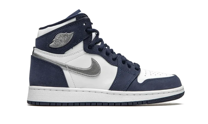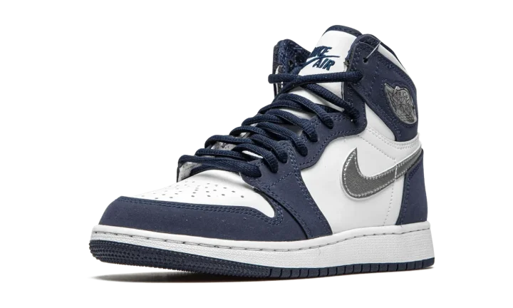 The Air Jordan 1 High Co.Jp GS "Midnight Navy" is the youth sizing of the limited edition colorway of Michael Jordan's first signature shoe that originated in Nike's "Concept Japan" collection. The global reissue of the "Midnight Navy" Jordan 1 includes fitting the shoe in sizing options for the family, as evidenced by this design produced for children. Based on the original design from 2001, the modern version of the high-top shoe features the same white leather detailing on the perforated toe, mid-panel, and collar. Contrasting Midnight Navy overlays in a smooth nubuck material are located on the forefoot, eyelets, collar, and heel. A Metallic Silver Swoosh appears on either side of the shoe. The hue is used again on the "Wings" detailing found on the collar. A white leather tongue with "Nike Air" embroidery completes the look of the Jordan 1 High Co.Jp GS "Midnight Navy" in youth sizing. Release date: November 14, 2020.