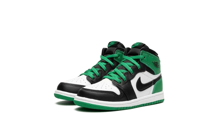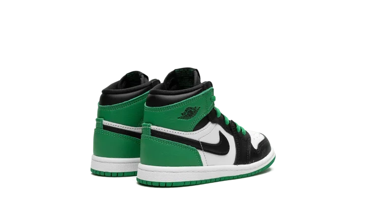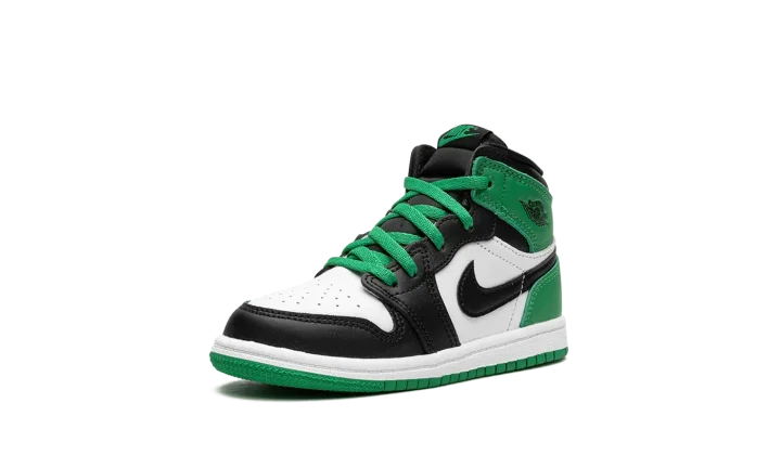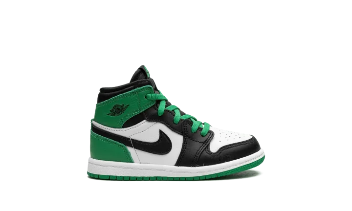 The Air Jordan 1 High TD "Lucky Green" is the toddler sizing of the colorway of the classic basketball shoe that is inspired by the popular "Celtics" style from 2009's "Defining Moments Pack." Although not identical to the Air Jordan 1's "Celtics" colorway from the aforementioned collection, the "Lucky Green" is nonetheless similar to the design. The shoe features a white leather base with contrasting black leather overlays on the toe cap, forefoot, and eyelets. Lucky-Green-colored leather appears on the heel and on the collar. A black leather Swoosh is found on either side of the shoe. Like the "Celtics" Jordan 1 from 2009, the "Lucky Green" features green laces. Where the shoes differ, though, is on the tongue. The "Lucky Green" has Nike branding whereas the "Celtics" colorway dons a Jumpman logo. Release date: April 15, 2023