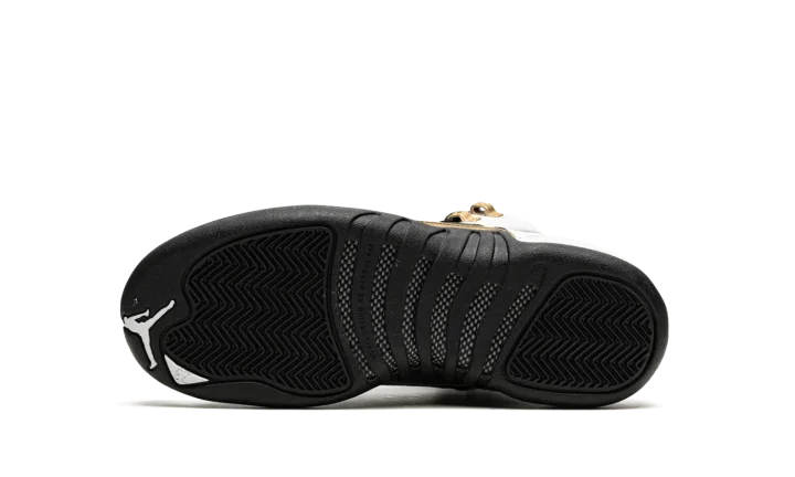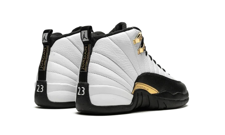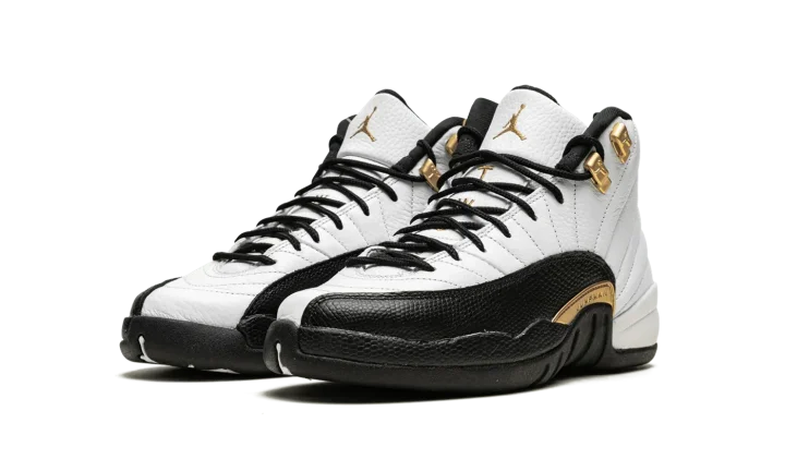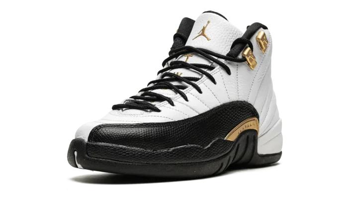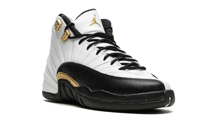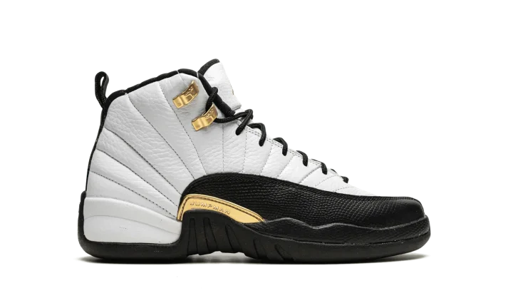 The Air Jordan 12 GS "Royalty Taxi" is the youth sizing of this close-to-original colorway of Michael Jordan's twelfth signaturel shoe from the late '90s. A Holiday 2021 release by Jordan Brand, the "Royalty Taxi" or "Royalty" copies the Air Jordan 12's original white-and-black "Taxi" color scheme, but with a few notable variations. One of the most notable modifications from the original "Taxi" is that the Jumpman plate above the midsole now appears in gold. Additional gold accenting can be found on the Jumpman-branded eyelet holders and on the Jumpman and "Two 3" detailing on the white leather tongue, the latter of which were previously seen in black on the first "Taxi" from November 1996. The revised look of the Air Jordan 12 "Royalty" honors the 25-year anniversary of the original "Taxi" release. Release date: November 13, 2021