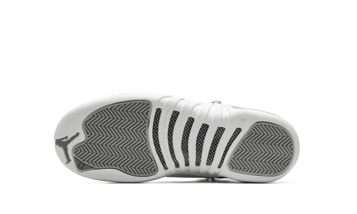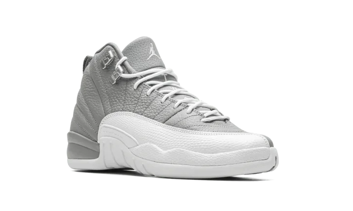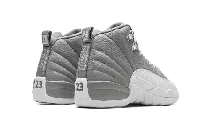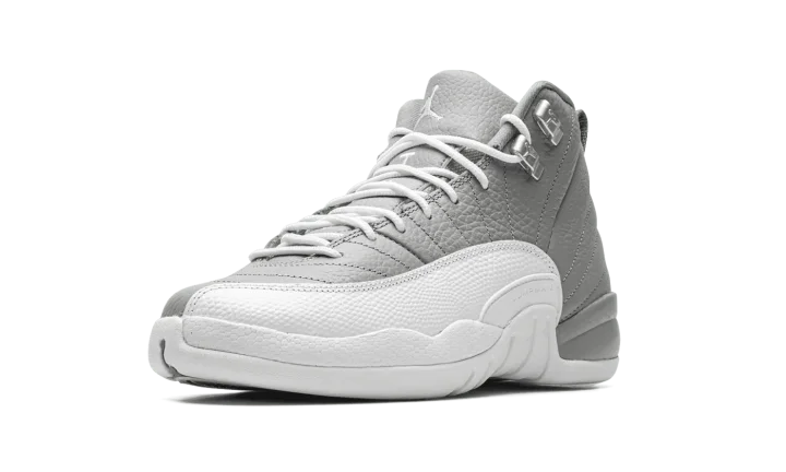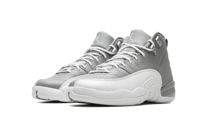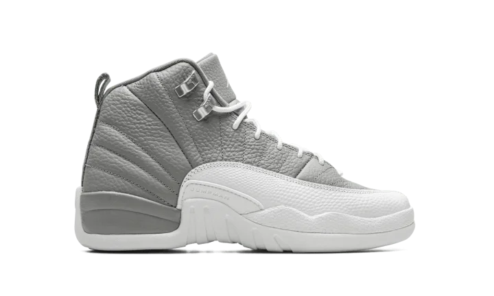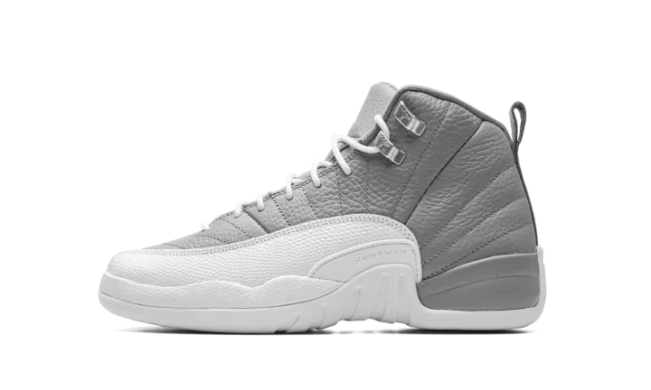 The Air Jordan 12 GS "Stealth" is the youth sizing of the retro basketball shoe in a two-tone grey and white colorway. Originally released in 1997, the Jordan 12 was worn by Michael Jordan with the Chicago Bulls during the '96-97 NBA season, and in the '97 NBA Playoffs. The "Stealth" honors the shoe's 25th anniversary. Details include a Stealth Grey tumbled leather upper paired with a white pebbled mudguard. Metallic Silver eyelets appear on the collar, and a grey nylon pull tab is found on the heel. Tonal "Jumpman" branding appears on the lateral side of the midsole. Release date: August 27, 2022