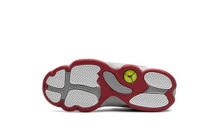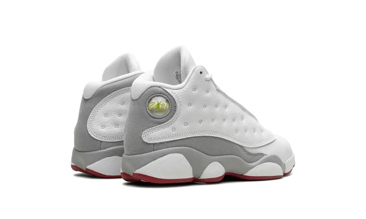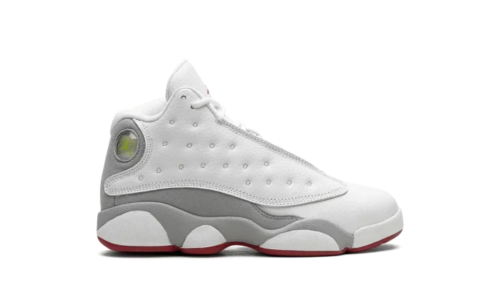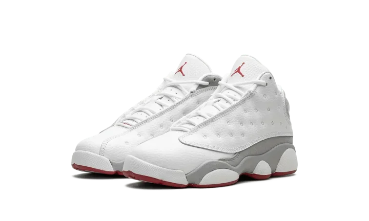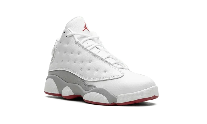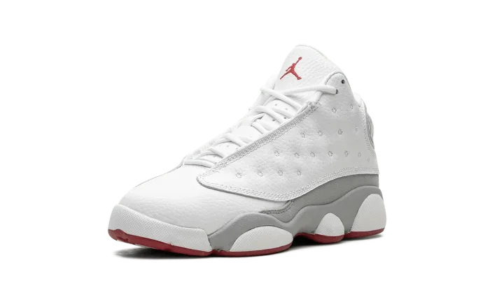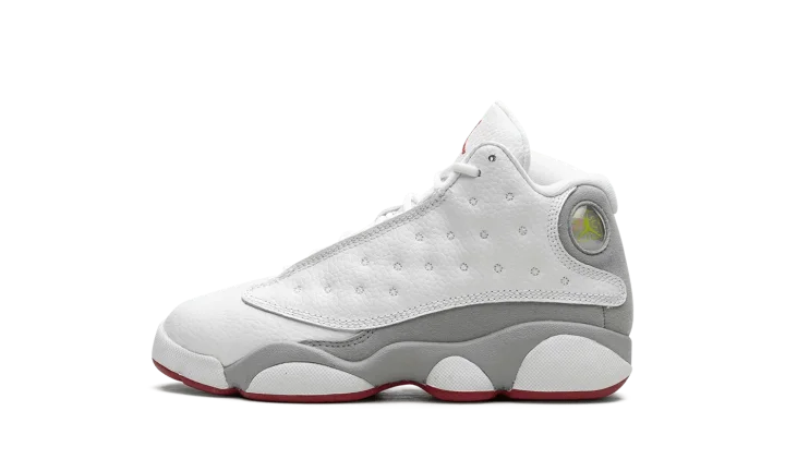 The Air Jordan 13 Retro PS "Wolf Grey" is the preschool sizing of the retro basketball shoe with neutral and red accents. An alternative to the classic "Chicago" theme that has appeared on iconic Air Jordan models, including the Jordan 13, the "Wolf Grey" features Michael Jordan's former basketball team's uniform colors, but with grey details in lieu of black accents. The shoe has a white dotted leather upper with a white leather toe. Wolf Grey suede appears on the side of the shoe. A red Jumpman is embroidered on the tongue. Release date: August 5, 2023