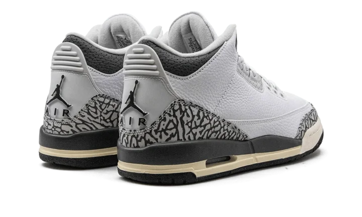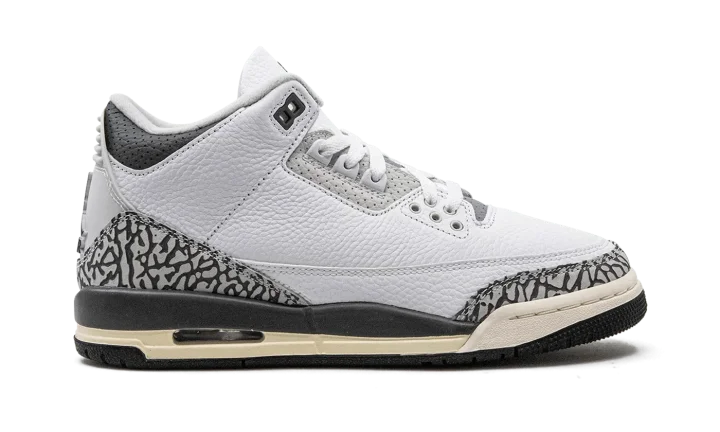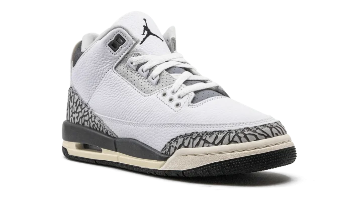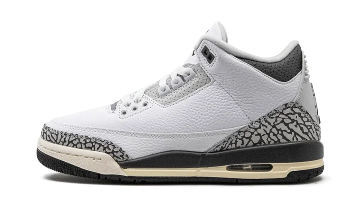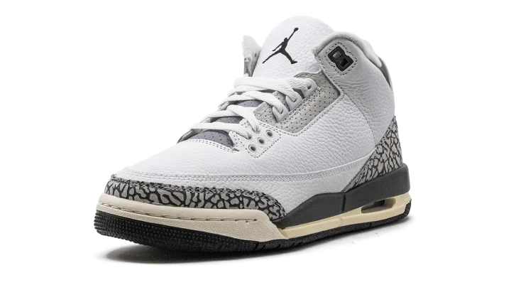 The Air Jordan 3 GS "Hide N' Sneak" is a kid's-only colorway of Michael Jordan's third signature shoe that celebrates Children's Day 2023. This special edition Jordan 3 in youth sizing features a white leather construction with grey elephant print on the toe and heel. Additional grey leather accenting appears on the eyelet panel, tongue, and collar. Classic Jumpman and "Air" branding are found on the heel. A Jumpman is also embroidered on the tongue. Underfoot, a Sail midsole and black rubber outsole complete the fun colorway. The shoe comes with a removable cartoon elephant patch. Release date: June 6, 2023
