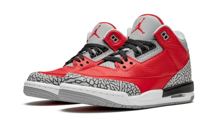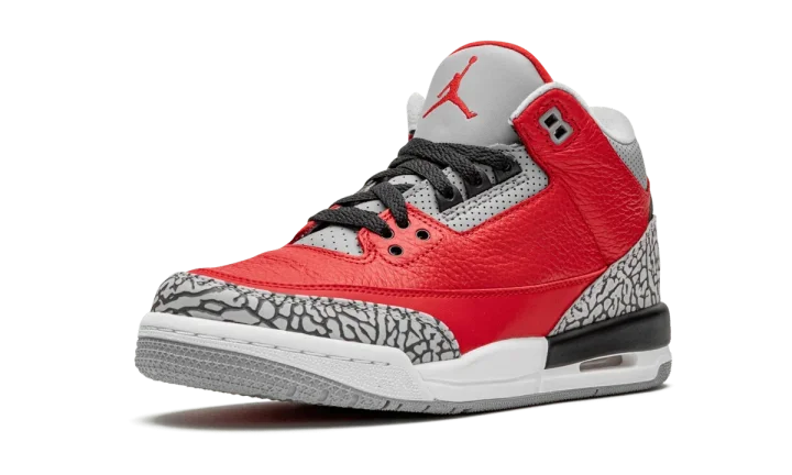 The Air Jordan 3 GS "Red Cement" is the grade school kids' sizing of the special colorway released during NBA All-Star Weekend 2020. Essentially a red version of the classic "Black/Cement" colorway, the "Red Cement" design looks like it could have been an original version of the Jordan 3 worn by Jordan on-court in 1988. This is achieved by retaining the same color block of the "Black/Cement" colorway, but replacing the black tumbled leather portions of the upper with Fire Red leather. The iconic elephant print panels are found in their usual places at the toe and heel, while original "Nike Air" branding graces the heel. The youth Jordan 3 "Red Cement" was released on February 15, 2020.