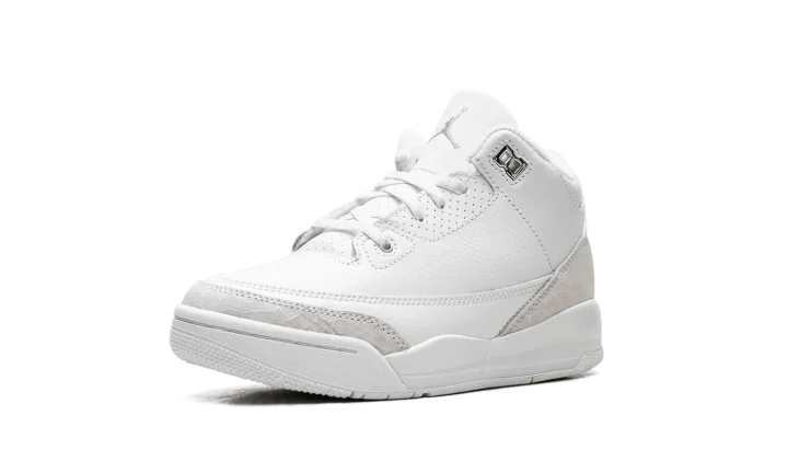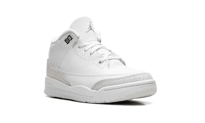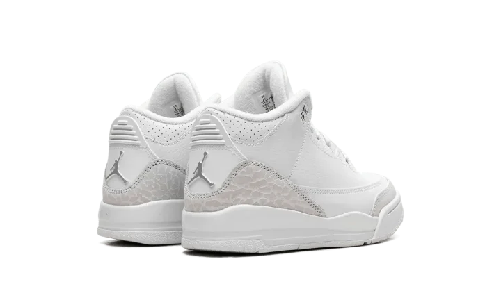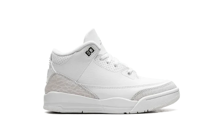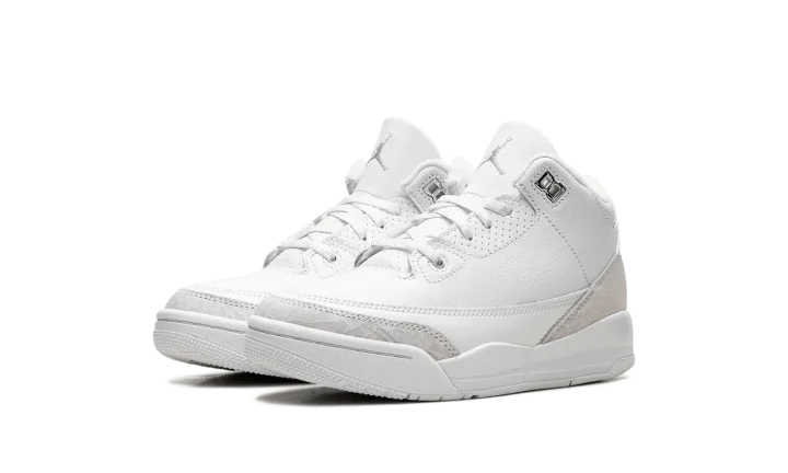 Introduce classic elegance with the Air Jordan 3 Retro PS "Pure Money (2025)." This Preschool-sized sneaker revives the highly sought-after all-white colorway for the next generation. It features a clean White tumbled leather upper with tonal elephant print overlays and subtle Metallic Silver accents on the eyelets and Jumpman logos. A visible Air-Sole unit in the heel provides essential cushioning, ensuring your child steps out in comfort and one of the most pristine colorways in Jordan history.