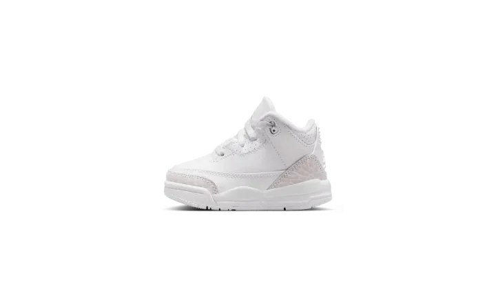 Prepare your toddler for pristine style with the Air Jordan 3 Retro TD 'Pure Money' (2025) sneaker. This tiny version of the ultra-clean classic features a durable white tumbled leather upper with signature tonal elephant print overlays. Subtle Metallic Silver accents on the Jumpman logos and eyelets add a flash of elegance, while the foam midsole ensures comfortable, supportive cushioning for growing feet. This shoe brings minimalist, fresh style to the next generation of sneaker enthusiasts!