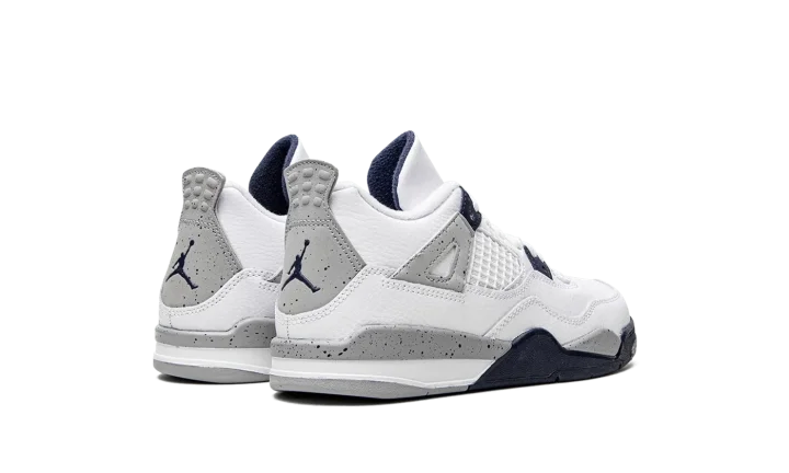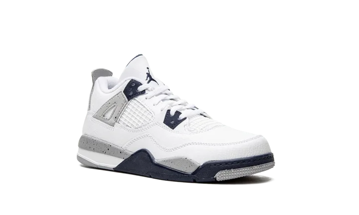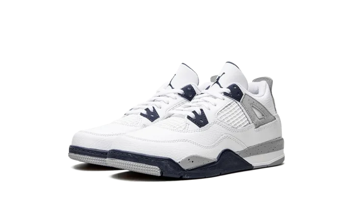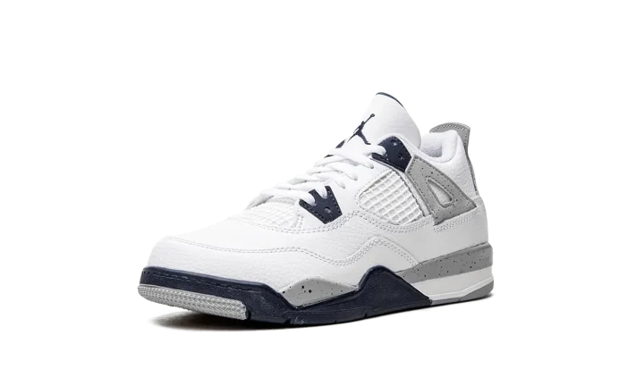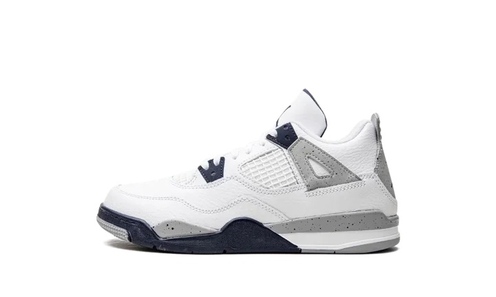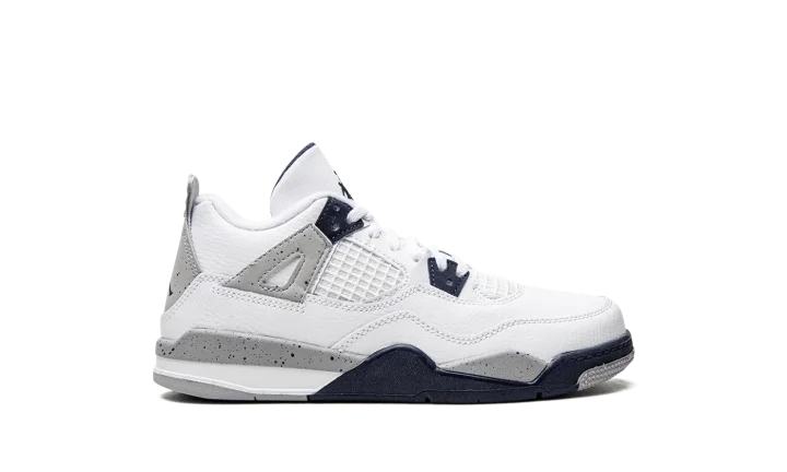 The Air Jordan 4 PS "Midnight Navy" is the preschool sizing of the colorway of retro basketball shoe inspired by the model's iconic "White Cement" style. The upper is constructed from white leather, save for the tongue and mid-panel which feature tonal mesh detailing. Midnight Navy plastic lace holders are found on the throat and collar. The Jordan 4's signature "Cement" detailing appears on the "Wings" tabs, on the mudguard, and on the Jumpman branded heel counter. Release date: October 29, 2022