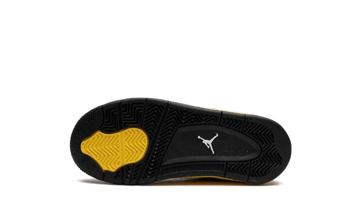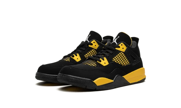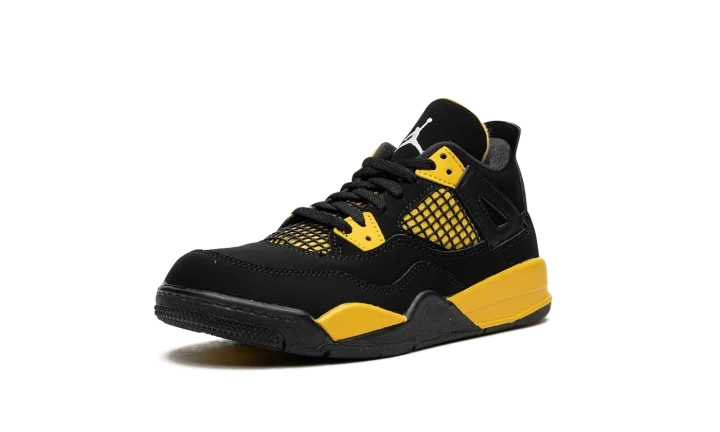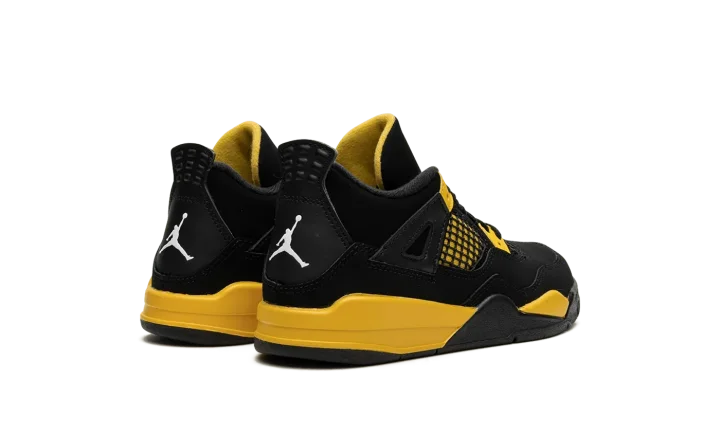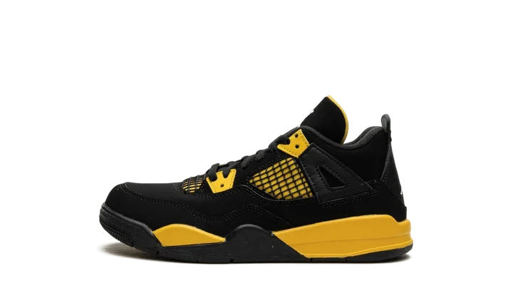 The Air Jordan 4 PS "Thunder" is the youth sizing of the modern re-release of the popular, non-original colorway of the vintage basketball shoe from 2006's "Thunder & Lightning" collection. Released with the Jordan 4 "Lightning" in super limited quantities on Jordan Brand's former Jumpman23.com website back in the day, the "Thunder" was re-released in 2012 before it received another highly anticipated release in 2023. As for its design, the black-and-yellow shoe features a black synthetic nubuck base with Tour Yellow detailing beneath the mesh on the sides and tongue. Yellow lace holders contrast the black upper. A white Jumpman appears on the heel and on the tongue. Release date: May 13, 2023