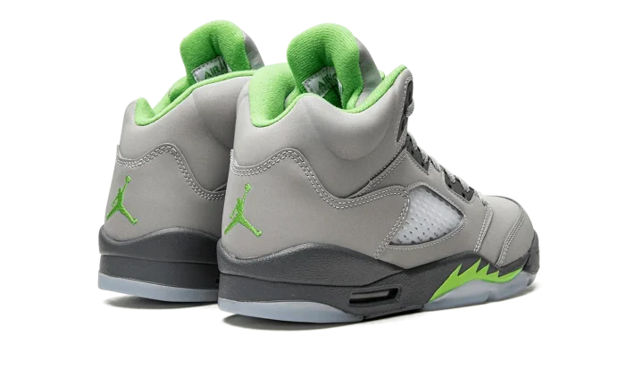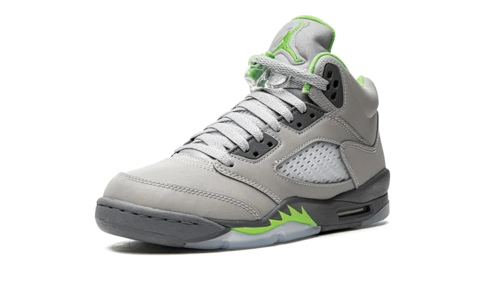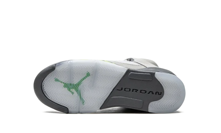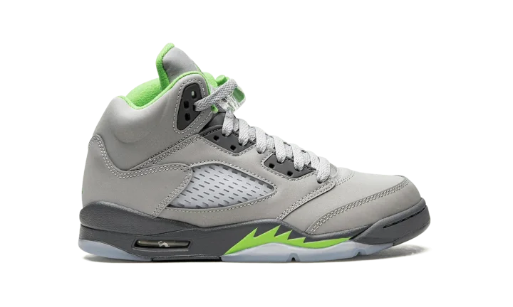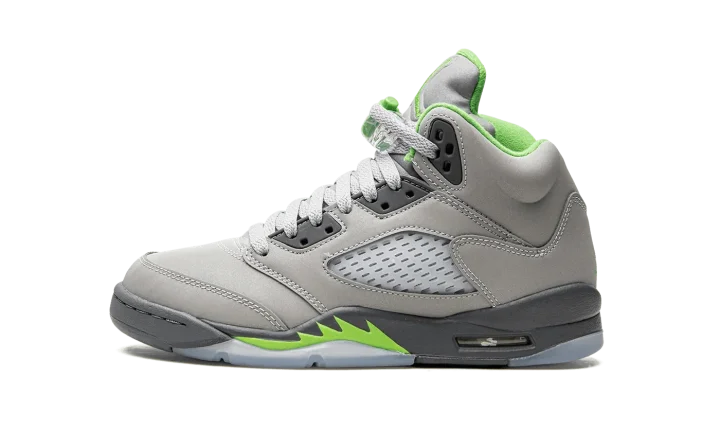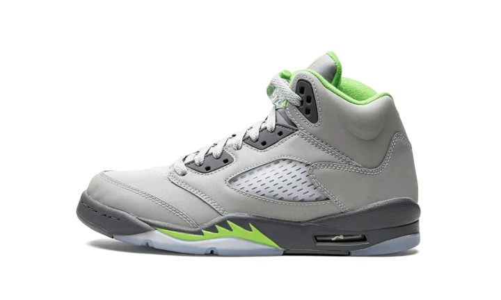 The Air Jordan 5 GS "Green Bean" is the youth sizing of the colorway of the retro basketball shoe with a reflective finish that was first released in 2006. This May 2022 version of the Jordan 5 GS "Green Bean" is nearly identical to the original version of the sneaker from '06. The shoe's grey synthetic upper is treated with a reflective finish that is supposedly inspired by the original sketch of the Jordan 5 by Tinker Hatfield. According to Nike, Hatfield originally designed the Air Jordan 5 with a fully reflective upper, but ultimately scrapped the idea prior to the shoe's production in 1990. As for the rest of the modern "Green Bean's" design, bright green accents appear on the interior lining, on the sharktooth detailing on the midsole, and on the embroidered Jumpman on the silver reflective tongue and on the heel. The shoe features translucent mesh on the sides and on the lower tongue. Release date: May 28, 2022