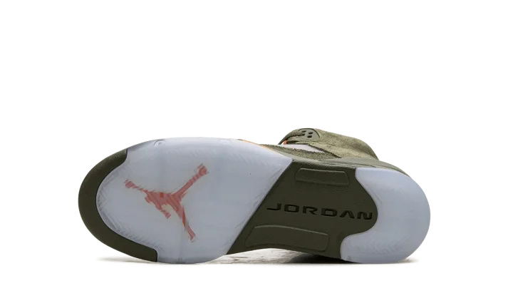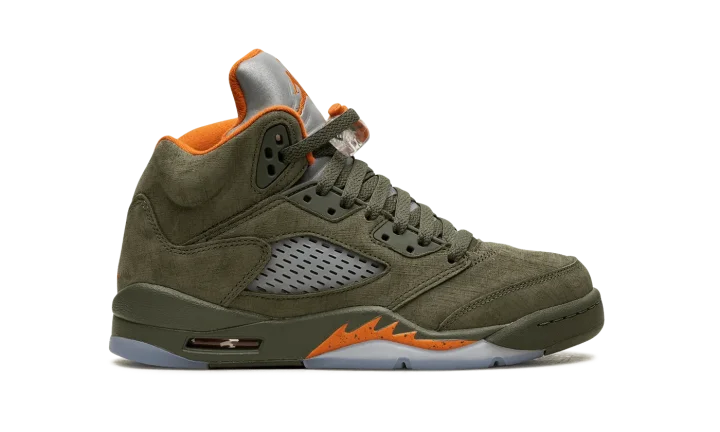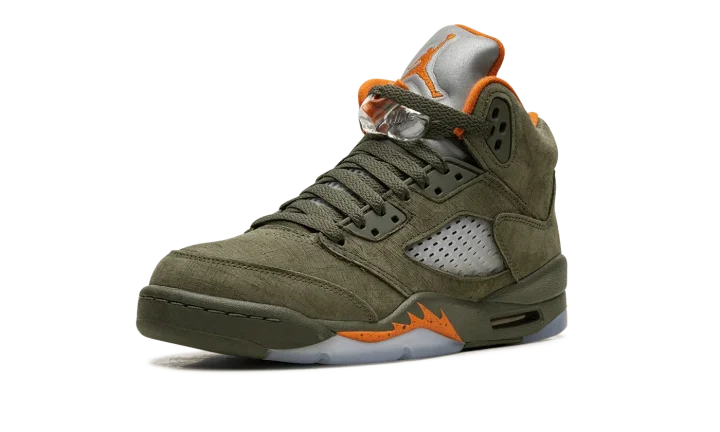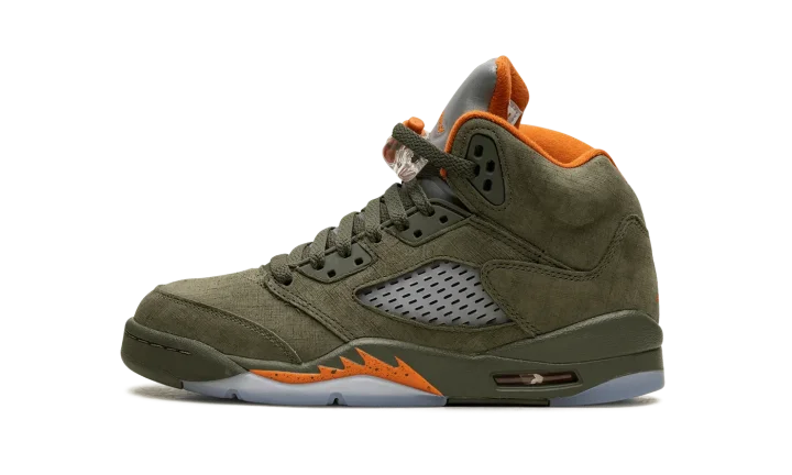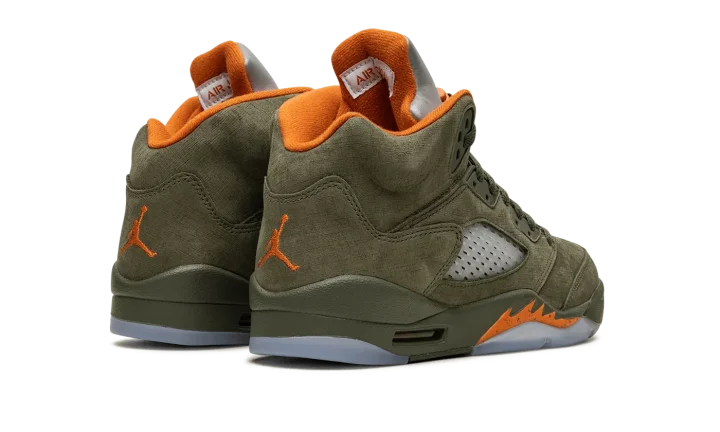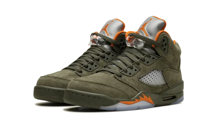 The Air Jordan 5 GS "Olive" is the youth sizing of the colorway that debuted in 2006 and was re-released in 2024. The Jordan 5 "Olive" was created as a lifestyle colorway in 2006 and brought back by Jordan Brand in 2024. The contemporary version of the shoe is identical to the original style from '06. The shoe features an Olive suede construction with translucent netting on both the mid-panel and on the tongue. A Solar Orange Jumpman appears on the silver reflective tongue and on the heel. Additional orange accenting is seen on the inner lining and on the shark tooth detailing on the forefoot of the olive midsole. An icy blue translucent rubber outsole completes the look.