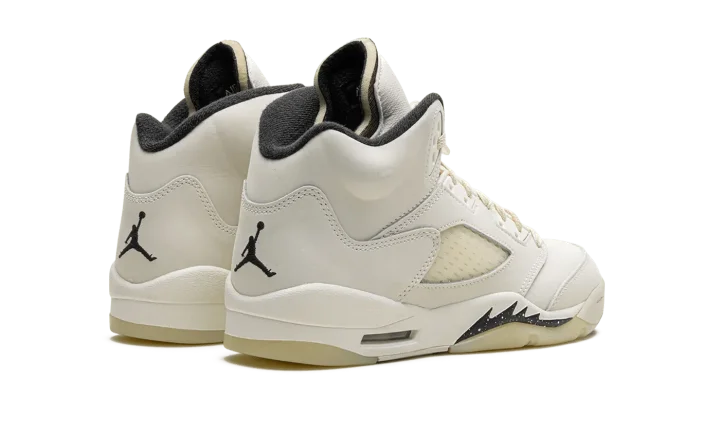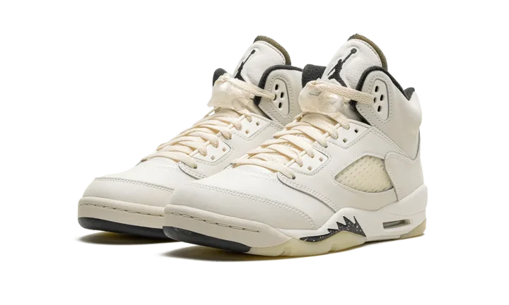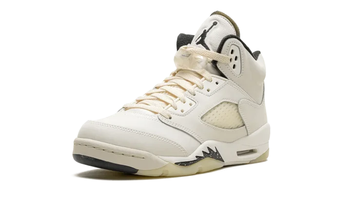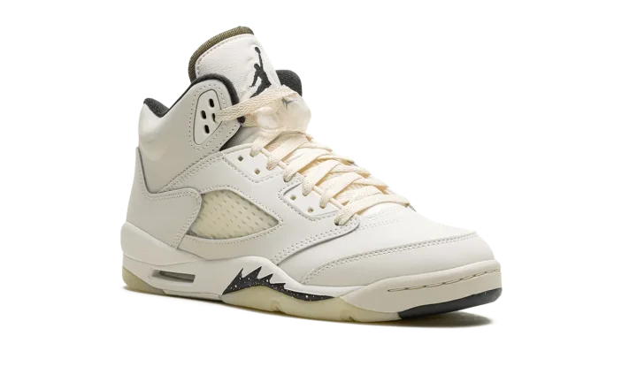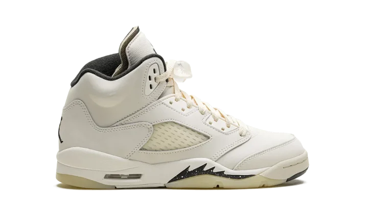 The Air Jordan 5 SE GS "Sail" is the youth sizing of Michael Jordan's fifth signature shoe with a versatile design. The "Sail" features a Sail leather base with Coconut Milk-colored accents on the netting found on the tongue and mid-panel. Contrasting black detailing is found on the Jumpman on the tongue, as well as on the inner lining, and Jumpman on the heel. Moreover, additional black detailing can be found on the speckled shark tooth design on the forefoot of the midsole. Underfoot, a Coconut Milk rubber outsole gives the shoe a classic, slightly aged aesthetic that ties into the Jordan 5's old school vibe. Release date: April 13, 2024