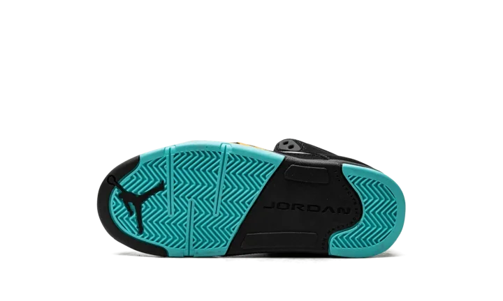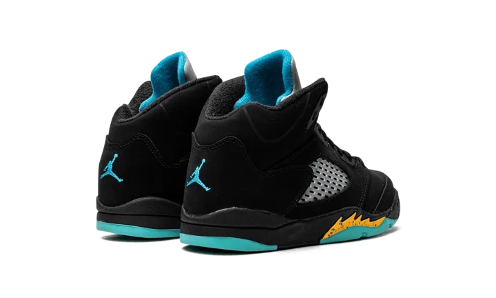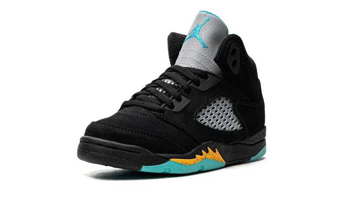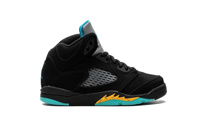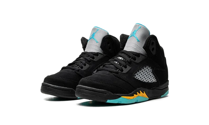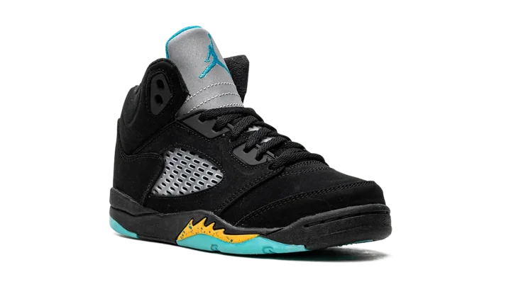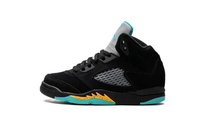 The Air Jordan 5 PS "Aqua" is the preschool sizing of the colorway of the retro basketball shoe in a look loosely inspired by a Player Exclusive of the shoe for Chris Paul in his time with the New Orleans Hornets. The "Aqua" is complete with a black synthetic nubuck construction with translucent netting on the sides and tongue. An Aqua-colored Jumpman is embroidered on the Metallic Silver reflective tongue and on the heel. Additional Aqua accenting can be found on the Jumpman on the lace toggle, on the inner lining, and on the shark tooth detailing on the midsole. Release date: April 8, 2023