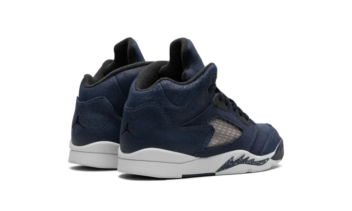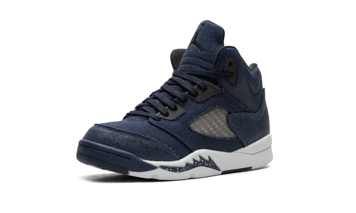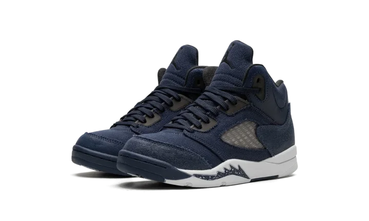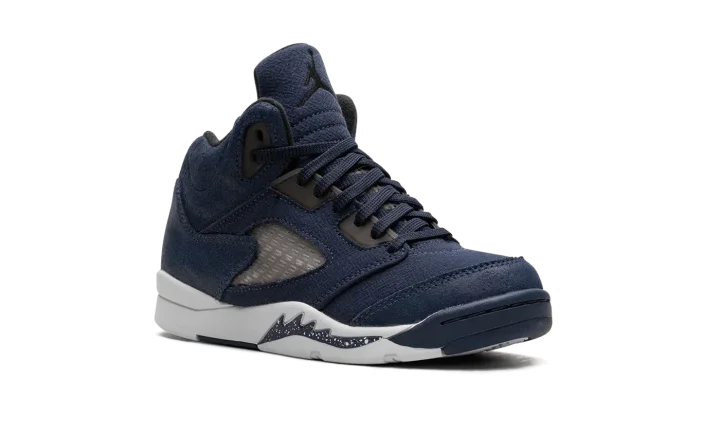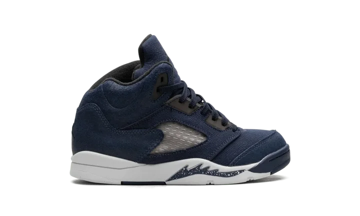 The Air Jordan 5 PS "Midnight Navy" is the preschool sizing of the fifth Air Jordan shoe in a colorway with a predominately navy-based look. Originally released in 1990, the Jordan 5 has maintained its status as one of the greatest sneakers ever thanks to its involvement in popular collaborations with brands like Off-White and colorways like the "Midnight Navy." The upper features a Midnight Navy textile construction with smoky translucent netting on the mid-panel and tongue. A black Jumpman is embroidered on the tongue and on the heel. Underfoot, the white midsole's classic shark tooth detailing is designed in navy with white speckling. An icy blue translucent rubber outsole completes the look. Release date: November 10, 2023