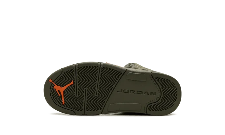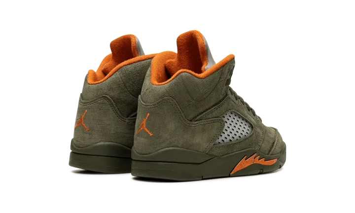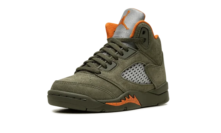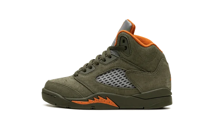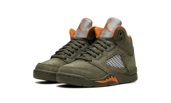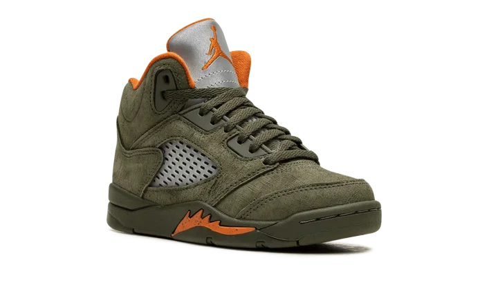 The Air Jordan 5 PS "Olive" is the preschool sizing for the modern re-release of the colorway that first released in 2006. An early lifestyle version of the Jordan 5, the "Olive" was released in the mid-2000s before it was brought back for the first time as a retro release in 2024. The contemporary version of the shoe is identical to the original style from '06. The shoe features an Olive suede construction with translucent netting on both the mid-panel and on the tongue. A Solar Orange Jumpman appears on the silver reflective tongue and on the heel. Additional orange accenting is seen on the inner lining and on the shark tooth detailing on the forefoot of the olive midsole. An icy translucent rubber outsole completes the look. Release date: March 9, 2024