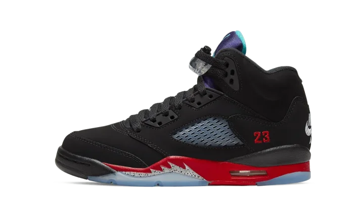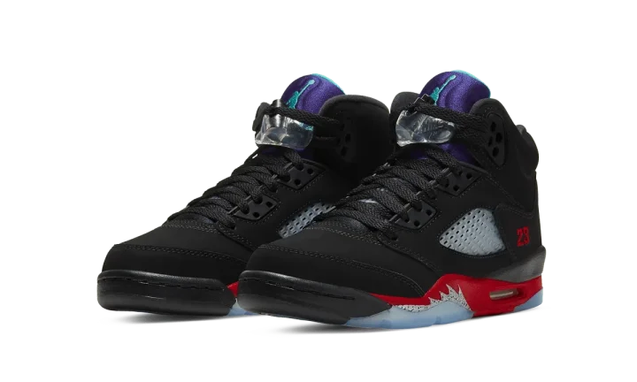 The Air Jordan 5 GS "Top 3" is the youth sizing of the release that incorporates three original, wildly popular colorways of Michael Jordan's fifth signature shoe. Combining the elements of the "Grape," "Black Metallic," and "Fire Red" Jordan 5, this amalgamation design hits all of the high notes of '90s nostalgia. Sporting a black nubuck base, translucent netting appears on the mid-panel and white embroidered "Nike Air" branding dots the heel. The purple neoprene tongue with turquoise Jumpman accenting is inspired by the iconic "Grape" design. Finishing touches include a fiery red "23" logo on the heel and a visible Air window encased within an equally bold red midsole with cement shark tooth detailing. The Air Jordan 5 GS "Top 3" was released on May 30, 2020.