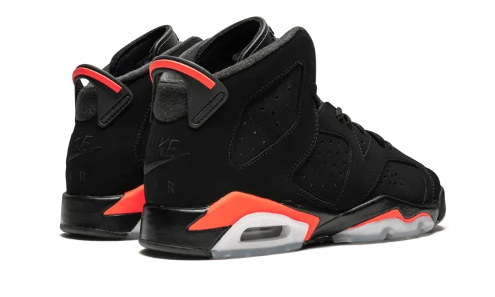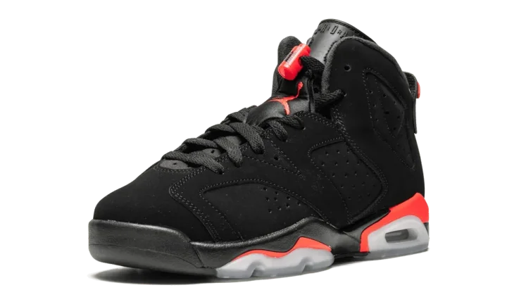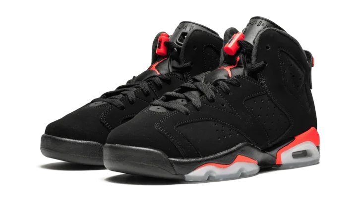 The Air Jordan 6 GS "Black/Infrared 2019" is the kids' grade school sizing for the iconic original colorway of the sixth Air Jordan. This 2019 retro of the famous "Black/Infrared" Jordan 6 originally worn by Michael Jordan in 1991 features period correct details, including the Nike Air logo embroidered in black on the heel, to go along with the black nubuck upper, neon red accents, and icy clear portions of the outsole. The Air Jordan 6 GS "Black/Infrared 2019" for kids released during NBA All-Star Weekend on February 16, 2019.