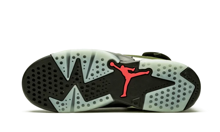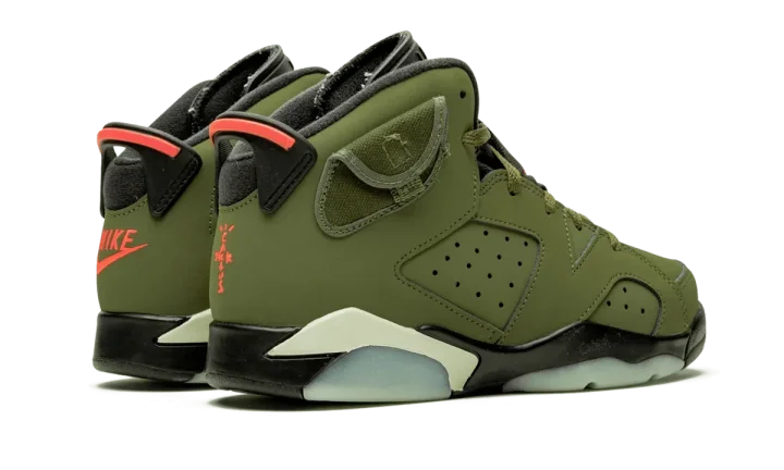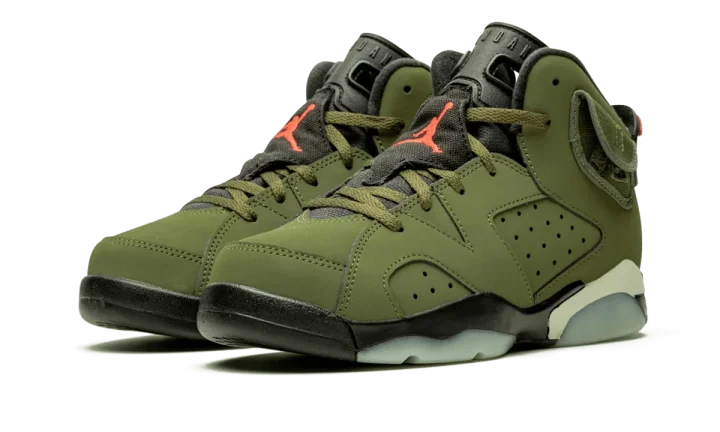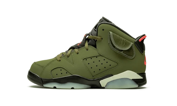 The Travis Scott x Air Jordan 6 PS is the preschool sizing of the famed Houston rapper's reimagining of Michael Jordan's sixth signature basketball shoe. Similar to its adult-sized counterpart, the youth version of Scott's collaborative Air Jordan 6 features a rich olive nubuck upper with perforations appearing on the mid-panel and forefoot. Contrasting orange embroidered Jumpman branding covers the black nylon tongues with orange embroidered Nike Air and Cactus Jack detailing appearing on the heels. Inspired by military cargo pants, as frequently worn by Scott, the ankle collar adds a cargo pocket with a snap closure. A black rubber midsole with translucent glow in the dark accents puts the finishing touches on the limited collaboration. The Travis Scott x Air Jordan 6 for little kids was released on October 11th, 2019.