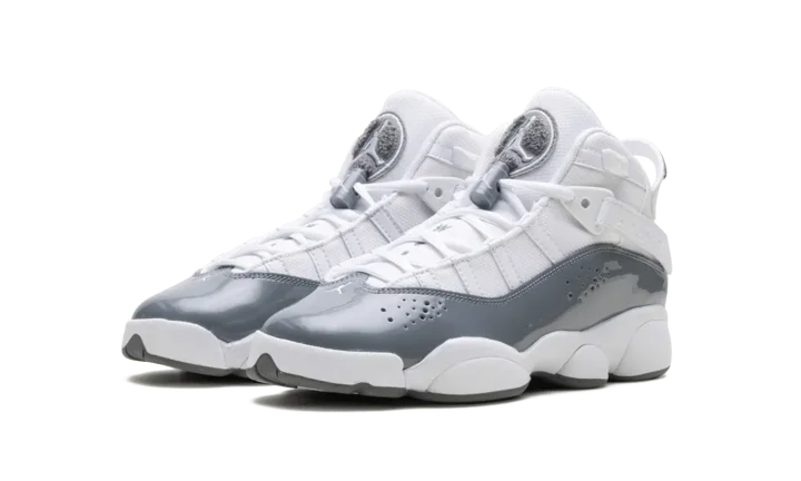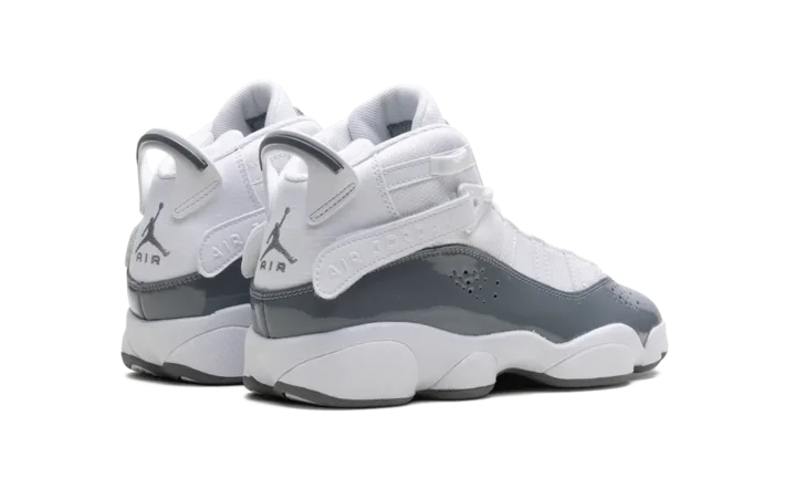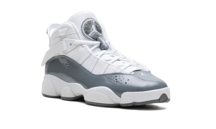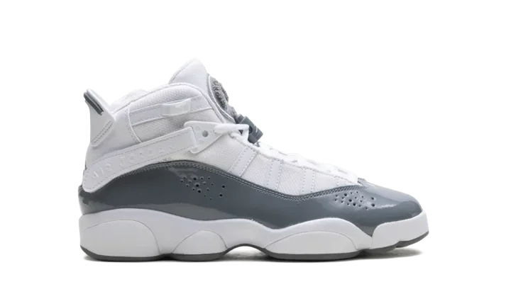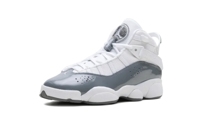 Own a piece of championship history with the Air Jordan 6 Rings GS "White/Cool Grey." This iconic Grade School sneaker hybrid celebrates all six shoes Michael Jordan wore during his NBA Championship wins. It blends legendary elements like the AJ11 patent leather mudguard and the AJ6 heel tab into one fresh, clean design. The cool grey accents perfectly complement the white upper for a classic look. Give your young superstar a durable, comfortable shoe with a champion's legacy built right in.