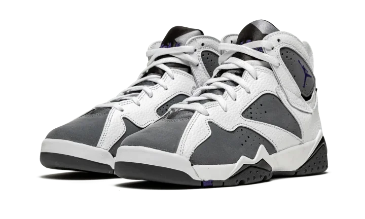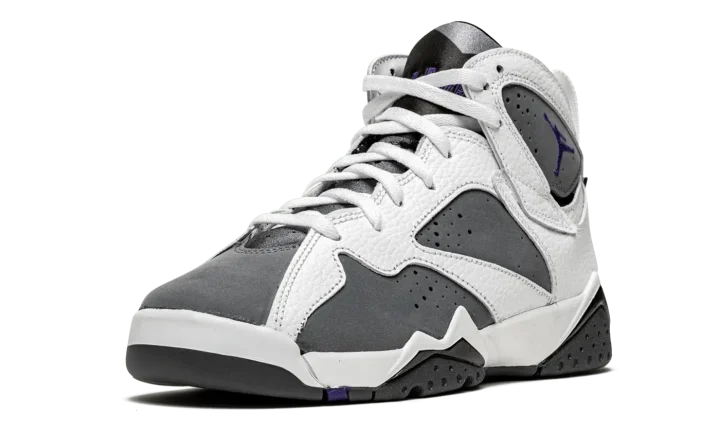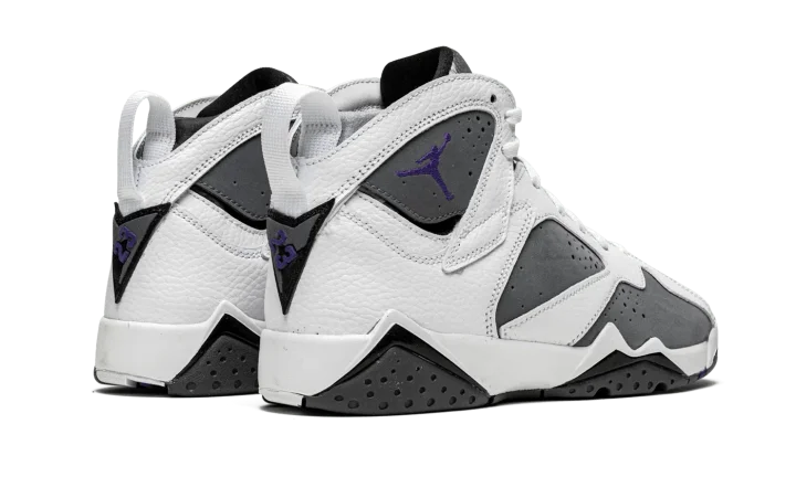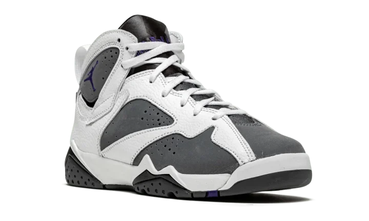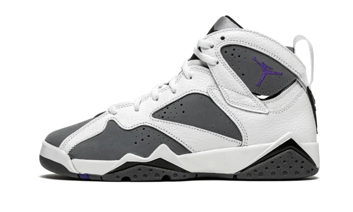 The Air Jordan 7 GS "Flint 2021" is the youth sizing of the colorway of Michael Jordan's seventh signature shoe that was originally introduced in 2006. Jordan Brand's mid-aughts release strategy included dressing classic Air Jordan styles like the Jordan 7 in new materials and colors that could be worn off the court. The "Flint" colorway was among the more popular looks at the time of its first release. After fifteen years in the vault, Jordan Brand finally brought the shoe back in May 2021. The upper's underlying base features a plush grey suede construction. White leather overlays on the forefoot, eyelets, mid-panel, collar, and heel contrast the look. A purple embroidered Jumpman can be found on the collar and purple "Air Jordan" detailing is stitched onto the multicolor nylon tongue. Release date: May 1, 2021.