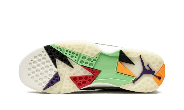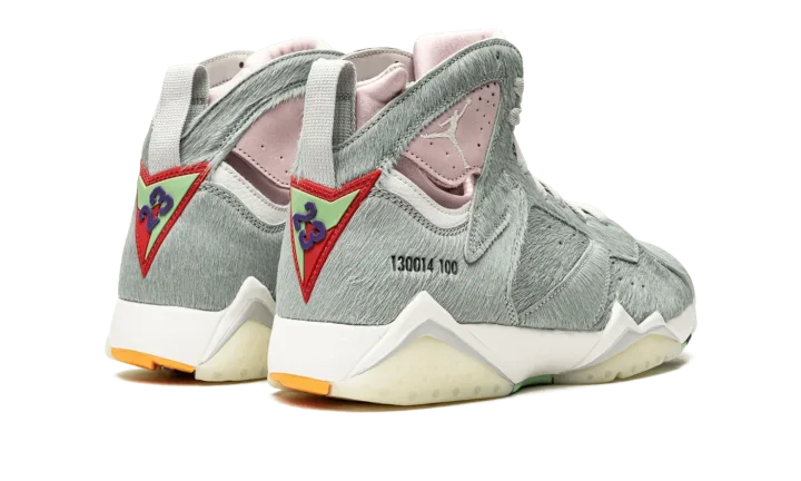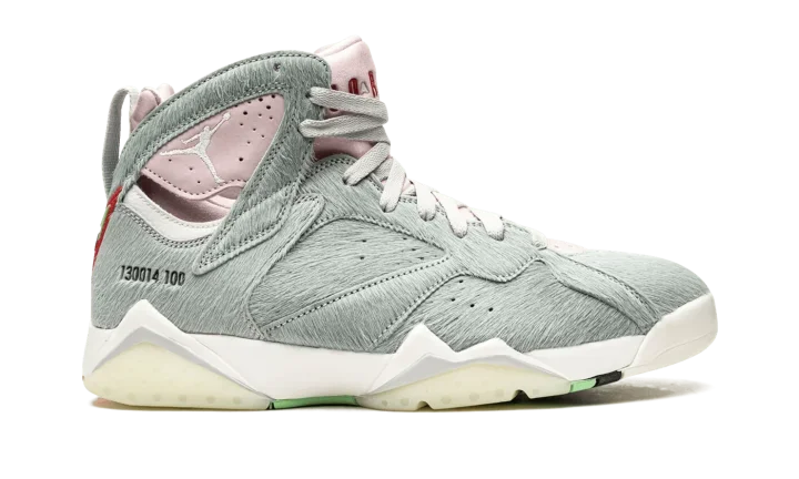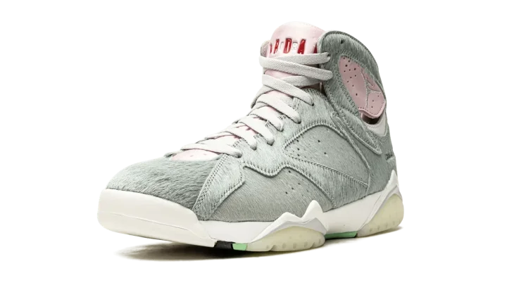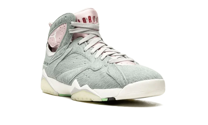 The Air Jordan 7 "Hare 2.0" marks the return of "Hare Jordan," the unofficial nickname of cartoon character Bugs Bunny. Though not an official collaboration, the predecessor to the original Jordan 7 "Hare" is nonetheless an overt nod to the classic design as it takes on a "lucky rabbit's foot" inspiration. A light green fur covers the entire upper, including the overlays across the forefoot, mid-panel, and collar. The style code of the original "Hare" design from 1991 is embroidered on the heel, while pastel pink leather encompasses the tongue and collar. White embroidered Jumpman detailing covers the collar and staggered "Air Jordan" detailing appears embroidered on the tongue. A white midsole and semi-translucent outsole finish off the look of the shoe. The Air Jordan 7 "Hare 2.0" was released on April 8, 2020.