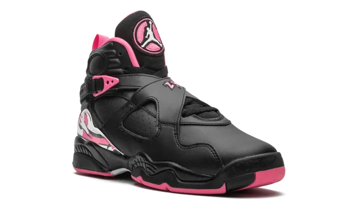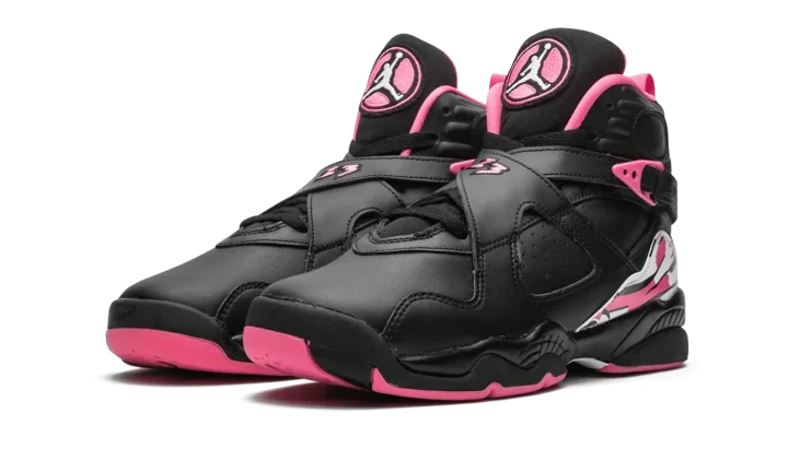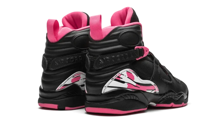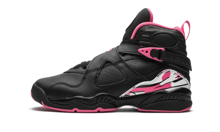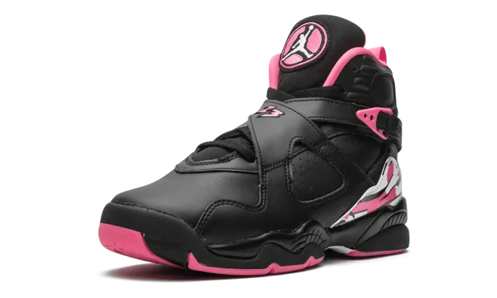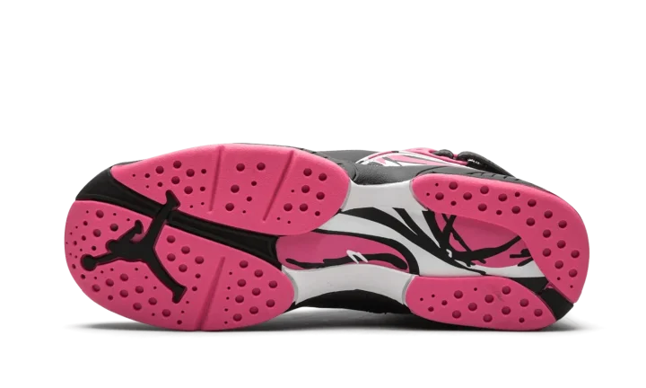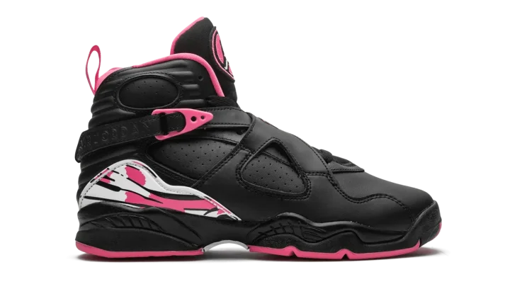The Air Jordan 8 GS "Pinksicle" is the youth sizing of Michael Jordan's eighth signature shoe in an appealing colorway for kids. The Jordan 8 is a decidedly early '90s performance basketball shoe that Jordan wore during the '92-93 NBA season in which he captured his third NBA Championship as a member of the Chicago Bulls. Whereas original Jordan 8 colorways featured a nubuck construction, the "Pinksicle" displays an all-black leather upper. Perforated black leather detailing can be found on the mid-panel. White and pink accenting appears on the mudguard on the heel. Additional Neon Pink detailing can be found on the plastic lace clips, "23" detailing on the black leather midfoot strap, on the sock liner, and on the circular Jumpman logo on the black nylon tongue. Release date: September 4, 2020