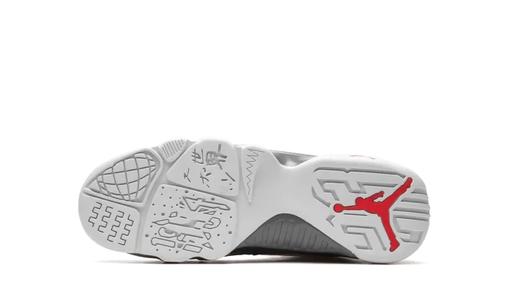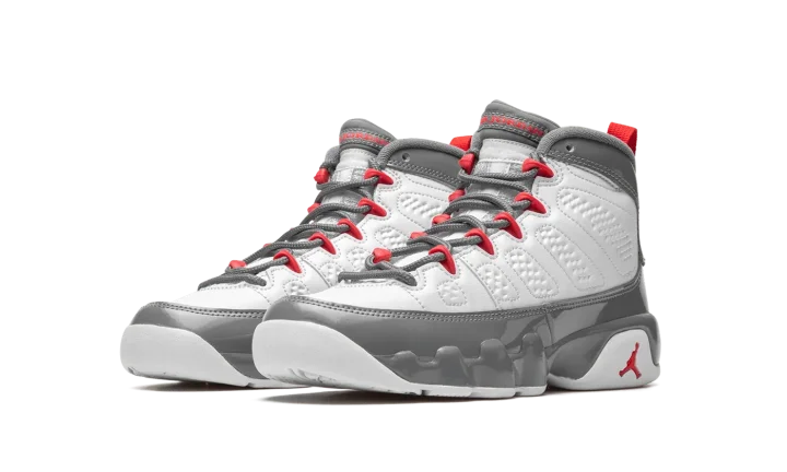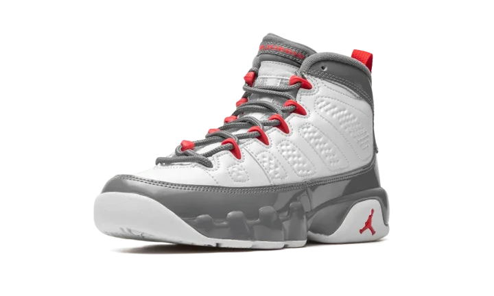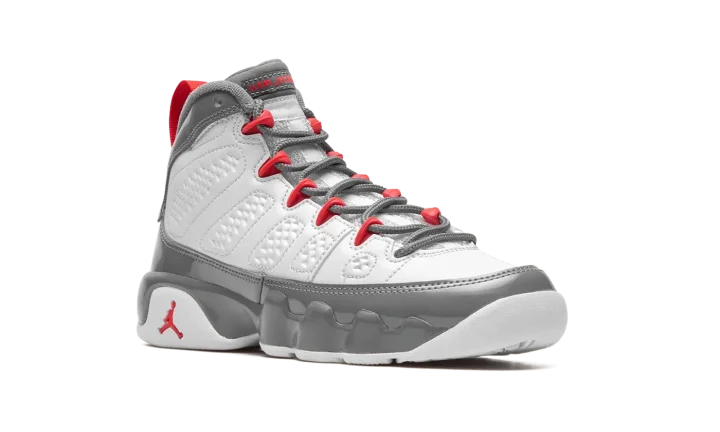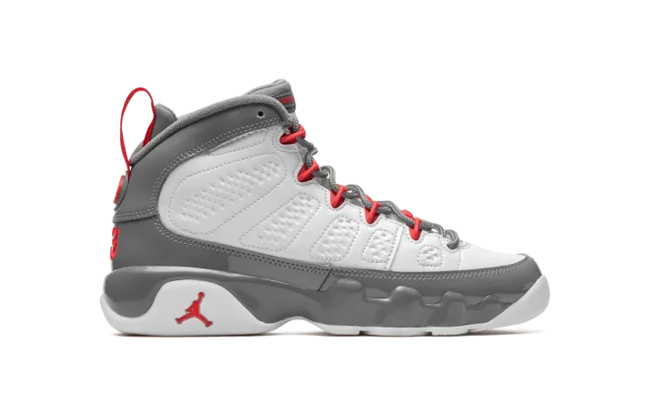 The Air Jordan 9 GS "Fire Red" is the youth sizing of the colorway of the classic shoe that is loosely inspired by the Chicago Bulls. As with other classic and popular Air Jordans in "Fire Red" colorways, this Jordan 9 features a fiery shade of red that is found on the Bulls' team uniforms. The shoe features a white leather construction with a contrasting grey patent leather mudguard overlay that extends from the toe up to the collar. Fire Red accents are found on the eyelet loops, on the pull tab on the heel, and on the "Jordan" branding on the tongue. A Fire Red Jumpman also appears on the lateral side of the white foam midsole. Release date: November 23, 2022