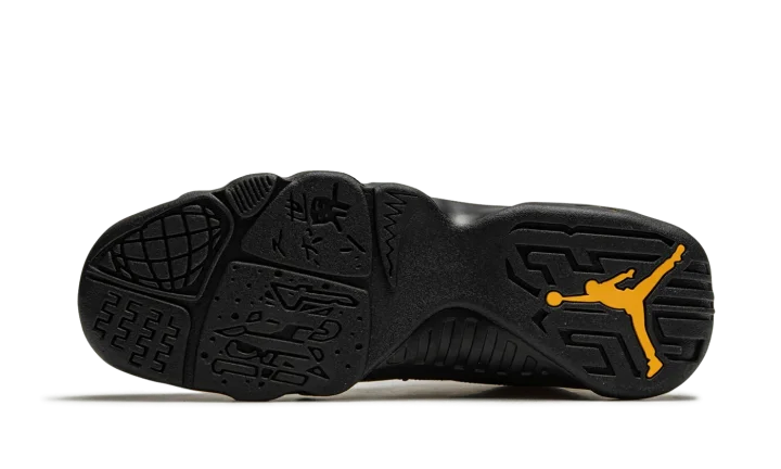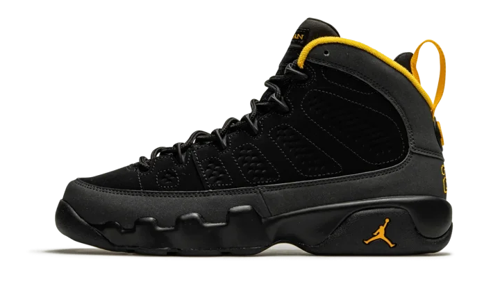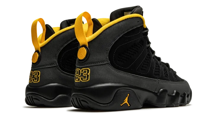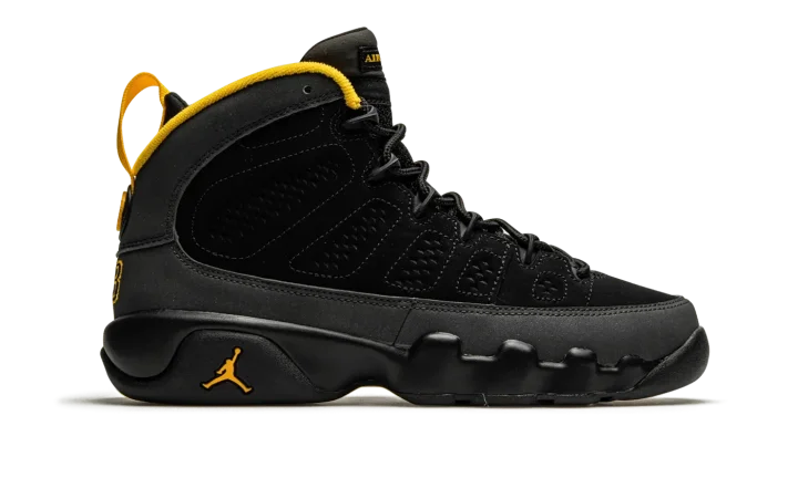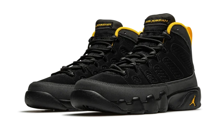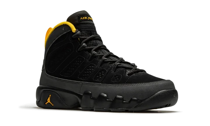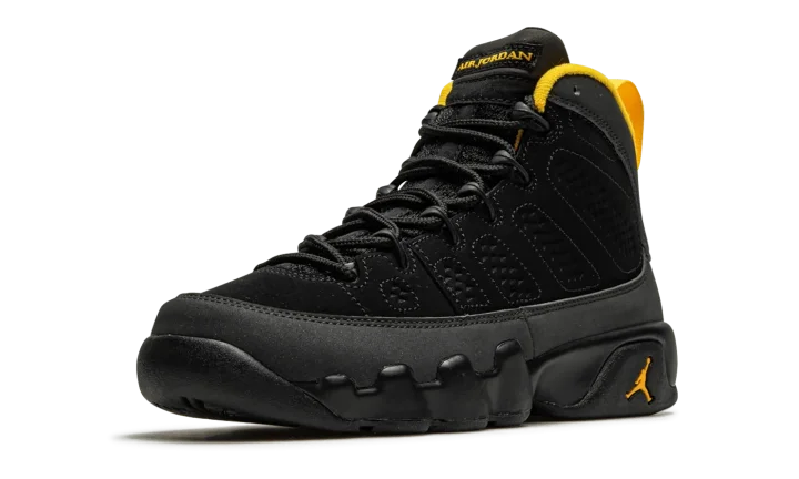 The Air Jordan 9 GS "University Gold" is the youth sizing of Michael Jordan's ninth signature shoe in a colorway that is based loosely on a popular look from 2010. The "University Gold" makes use of a similar shade of yellow as that of the "Citrus" Jordan 9 from July 2010. Both colorways feature a predominantly neutral design and employ subtle pops of orange or, in this case, yellow. The rest of the "University Gold" displays a synthetic black nubuck construction with a "diamond" perforation motif appearing along the medial and lateral sides of the shoe. A grey synthetic nubuck mudguard above the black midsole breaks up the look. University Gold accents can be found on the liner, pull tab, and "Air Jordan" detailing on the tongue. Jordan Brand uses the same hue of yellow on the embroidered "23" logo on the heel and Jumpman insignia on the sole. A mini "globe" emblem appears on the back of the shoe. Release date: January 30, 2021.