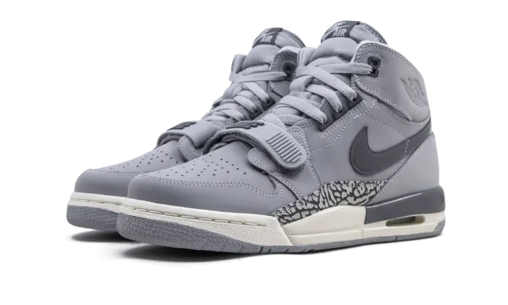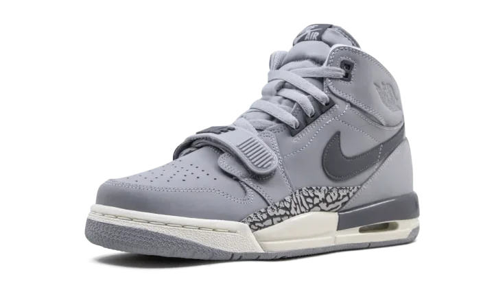 The Air Jordan Legacy 312 takes standout features of past Jordan and Nike silhouettes to create a mashup sneaker masterpiece. This style is designed for kids. The basketball-inspired lifestyle lace-up is made with a smooth light grey leather upper, familiar elephant print in the lateral midfoot, and a midfoot strap. A darker shade of grey handles the Nike branding hits, while a cream-colored midsole finishes off the neutral color scheme. The versatile shoe borrows elements from the famous Air Jordan 1, Air Jordan 3, and Nike Alpha Force.