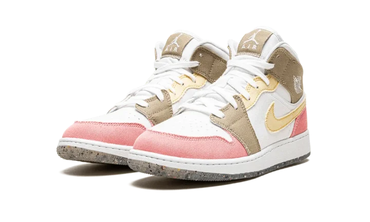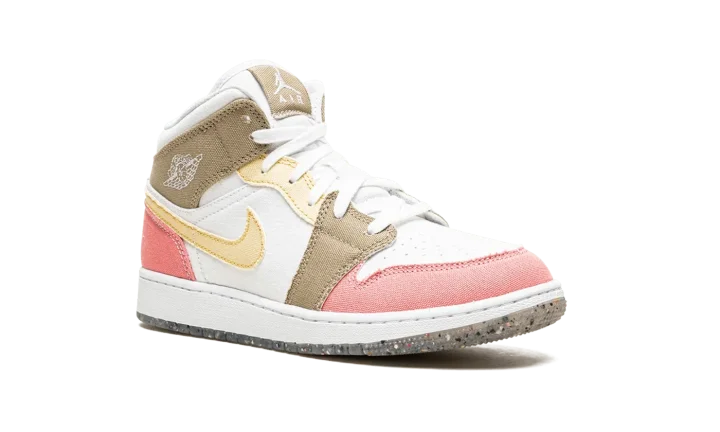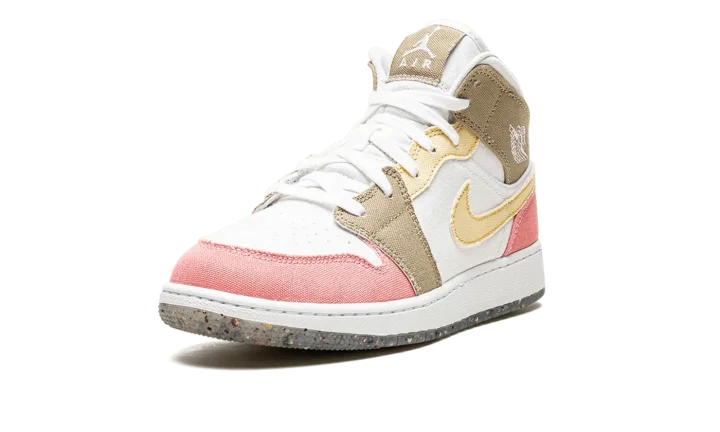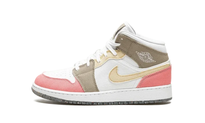 The Air Jordan 1 Mid GS "Pastel Grind" is a youth colorway of the mid-top version of Michael Jordan's first signature shoe constructed with environmentally conscious materials. The "Pastel Grind" is yet another release from Nike's "Move to Zero" initiative that aims to reduce the company's carbon footprint. Here, the sneaker features various overlay panels in pastel colors such as pink, yellow, and neutral brown. The shoe is constructed with a white canvas base. Contrasting pink canvas appears on the toe cap and heel while tan canvas is found on the forefoot and collar. The eyelets and Swoosh are designed in yellow canvas. Underfoot, the outsole is composed of recycled scraps from Nike's cutting room floor, otherwise known as Nike Grind material.