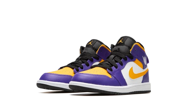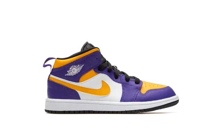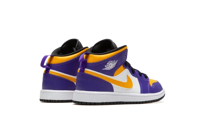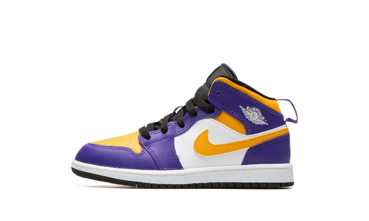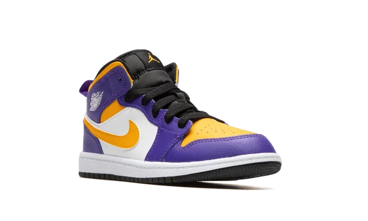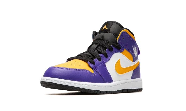 The Air Jordan 1 Mid "Lakers" is the preschool sizing of the mid-top shoe inspired by the Los Angeles Lakers. Not officially affiliated with the Lakers, the Jordan 1 Mid is nonetheless outfitted in the team colors of the team Michael Jordan and the Chicago Bulls defeated in the 1991 NBA Finals, and it certainly doesn't disappoint. The Jordan 1 Mid for kids features yellow leather on its perforated toe while white leather is found on the mid-panel. The overlay panels are designed in Dark Concord leather. A yellow Swoosh is found on both sides. A purple pull tab and purple laces are added to complete the Lakers look.