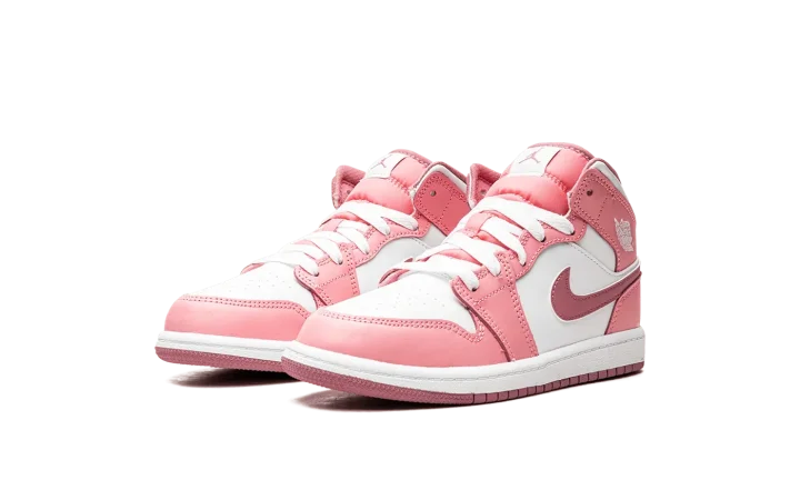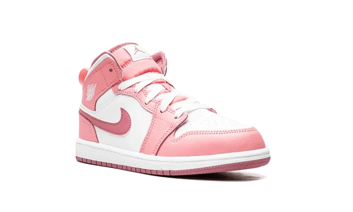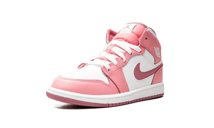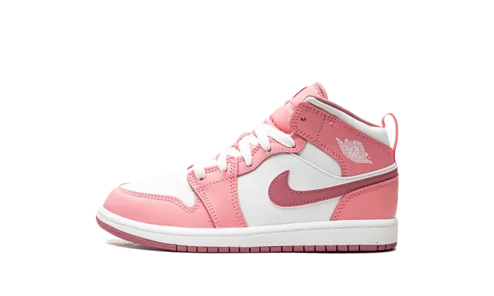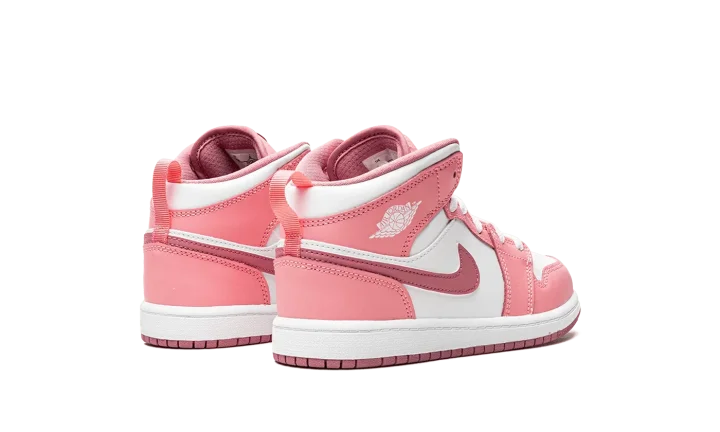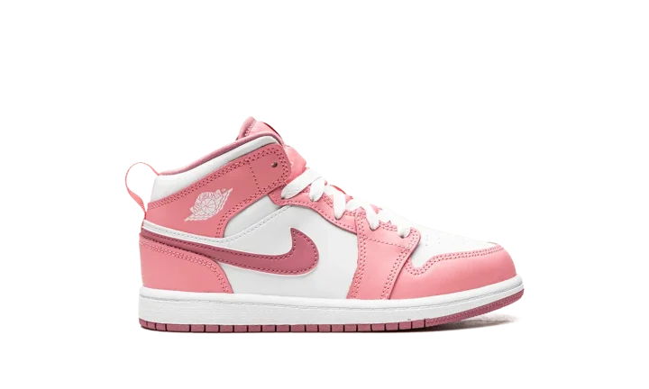 The Air Jordan 1 Mid PS "Valentine's Day 2023" is the preschool sizing of the mid-top sneaker in a colorway inspired by the February holiday. The shoe features a white leather base contrasted with pink leather overlays. A slightly darker shade of pink leather is used on the Swoosh logo on the sides. Additional branding includes a white "Wings" logo on the collar and a Jumpman on the tongue tag. Underfoot, a white rubber midsole and pink outsole complete the look. Release date: March 21, 2023