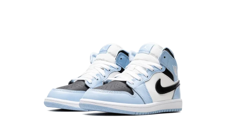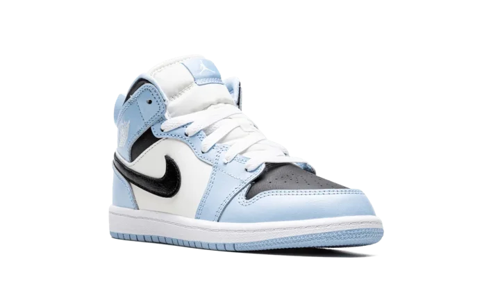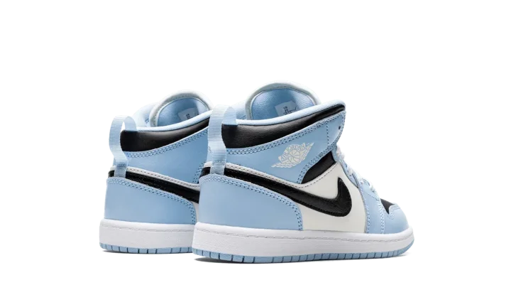 The Air Jordan 1 Mid PS "Ice Blue" is the preschool sizing of the lifestyle sneaker with light blue accents. This Jordan 1 Mid features a slight nod to the University of North Carolina, Michael Jordan's alma mater, with its Ice Blue accents that are loosely inspired by the school's primary color on its team uniforms. The shoe features a black leather perforated toe with Ice Blue leather overlays and a white leather mid-panel. A black leather Swoosh appears on the sides. White "Wings" branding is found on the collar. An Ice Blue pull tab on the heel assists with easy on/off wearability. Release date: September 19, 2022