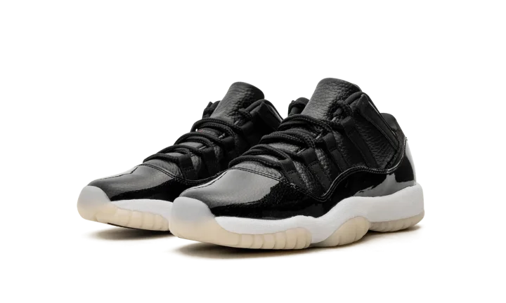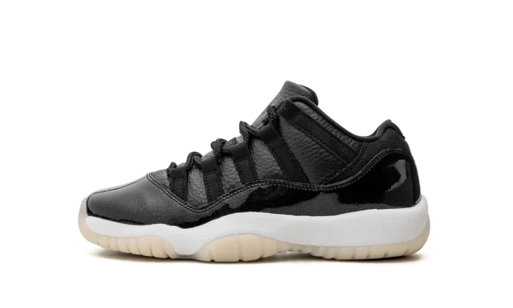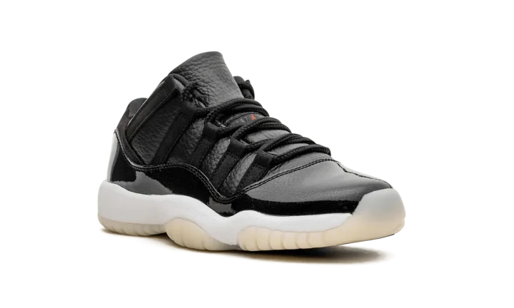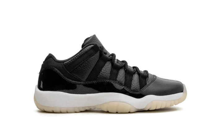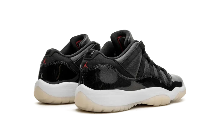 The Air Jordan 11 Low GS "72-10" is the youth sizing of the low-top version of the colorway that pays homage to Michael Jordan and the Chicago Bulls' historic 1995-96 NBA season. The original Jordan 11 "72-10" debuted on the retro basketball shoe's high-top model in December 2015 and shows appreciation for Jordan and the Bulls' historic season. Jordan Brand re-issued the Jordan 11 "72-10" as a low-top in May 2022. The modern "72-10" is a one-to-one copy of the original Jordan 11 "72-10" from 2015. The shoe features a black tumbled leather upper with a shiny black mudguard. A red Jumpman logo appears on the heel. A classic "JUMPMAN JORDAN" logo is found on the middle of the tongue. A white midsole and milky translucent outsole complete the look. Release date: May 14, 2022