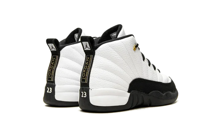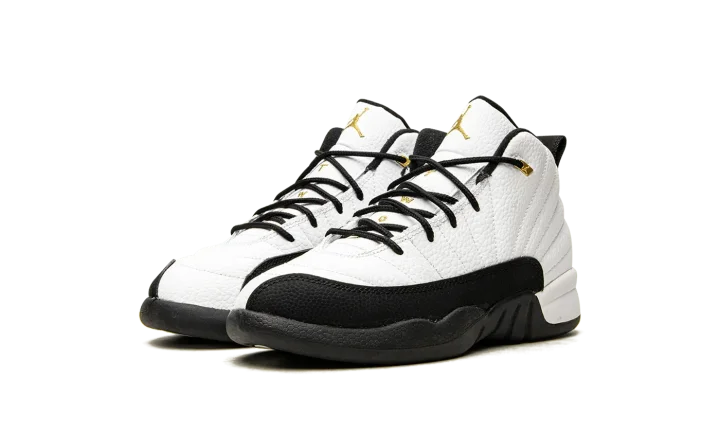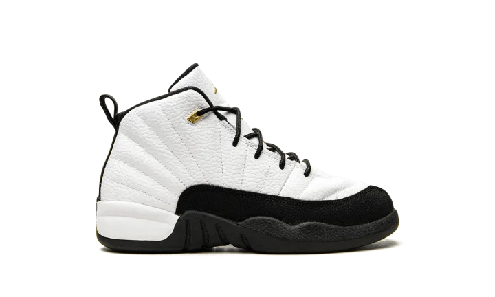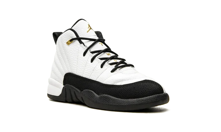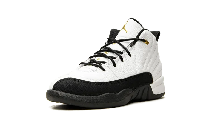 The Jordan 12 Retro "Royalty" is the Preschool kids sizing of the clean black, white, and gold colorway. A reimagined version that mimics the Air Jordan 12's original white-and-black "Taxi" colorway from the late '90s, this style comes with a few modifications. The Jumpman plate above the midsole is done in gold, and additional gold accenting appears on the Jumpman-branded eyelet holders and Jumpman and "Two 3" detailing on the white leather tongue. A black rubber sole grounds the preschool Jordan sneaker.
