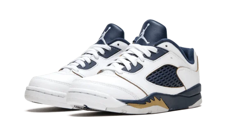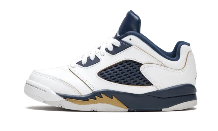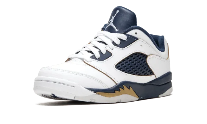 The Air Jordan 5 Retro Low gives little kids an iconic sneaker style to wear, just like the adults. Modeled after the original Air Jordan 5 and inspired by Michael Jordan's fourth scoring title, this tiny iteration is available in preschool sizes. The Jordan sneaker sports a white upper and navy blue and metallic gold accents. A leather upper gives the Air Jordan 5 Retro Low comfort and the inner sleeve provides little ones with a snug, comfortable fit.